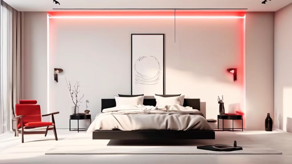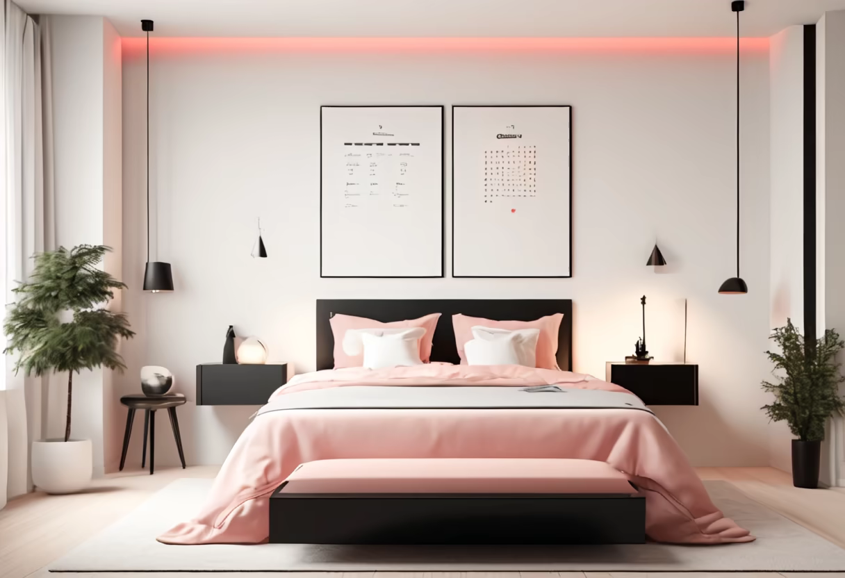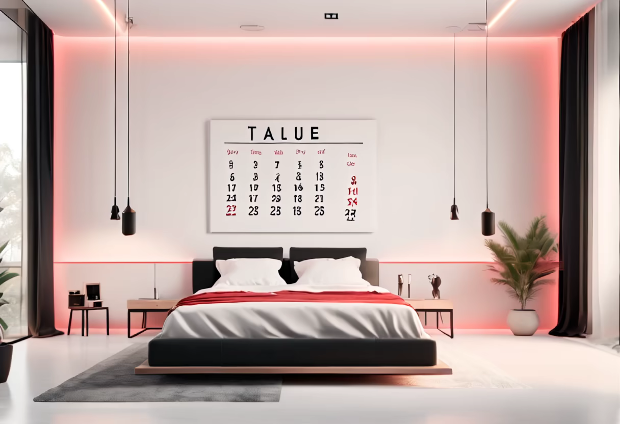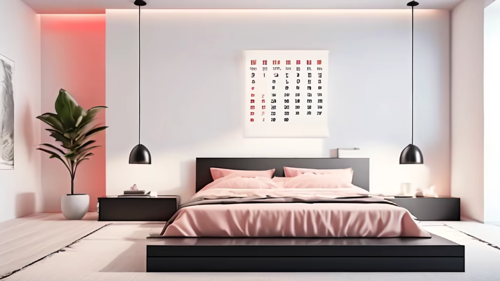 Prompt: minimalist bedroom with an off-white color scheme, featuring a statement black table that holds a wooden perpetual calendar with LED lighting. Decorative elements in red, light pink, and light blue add a touch of elegance to the space.