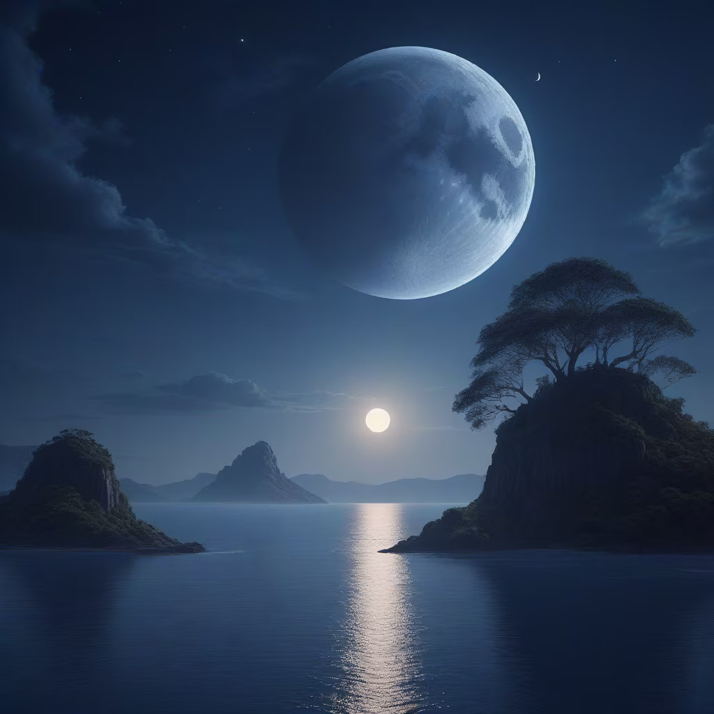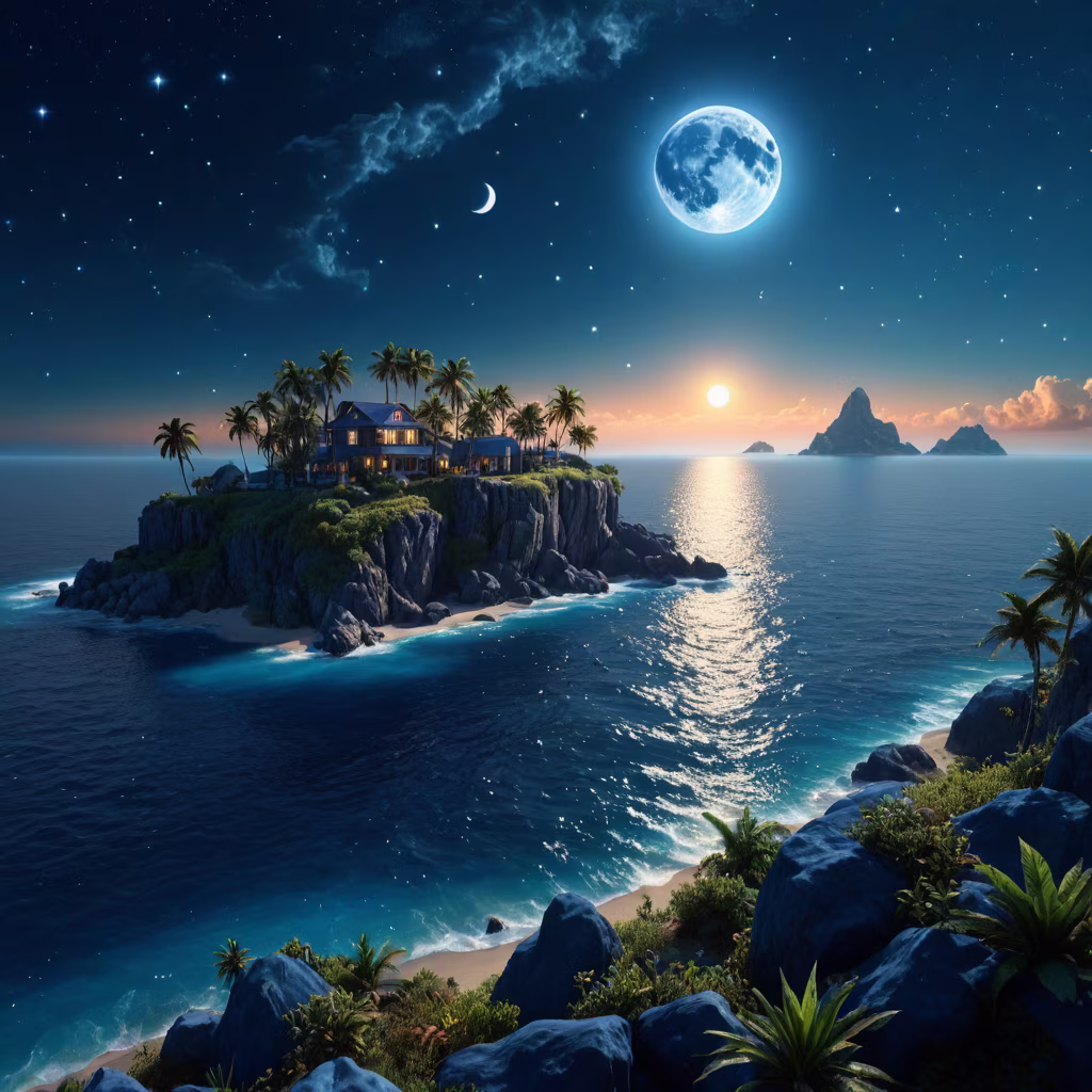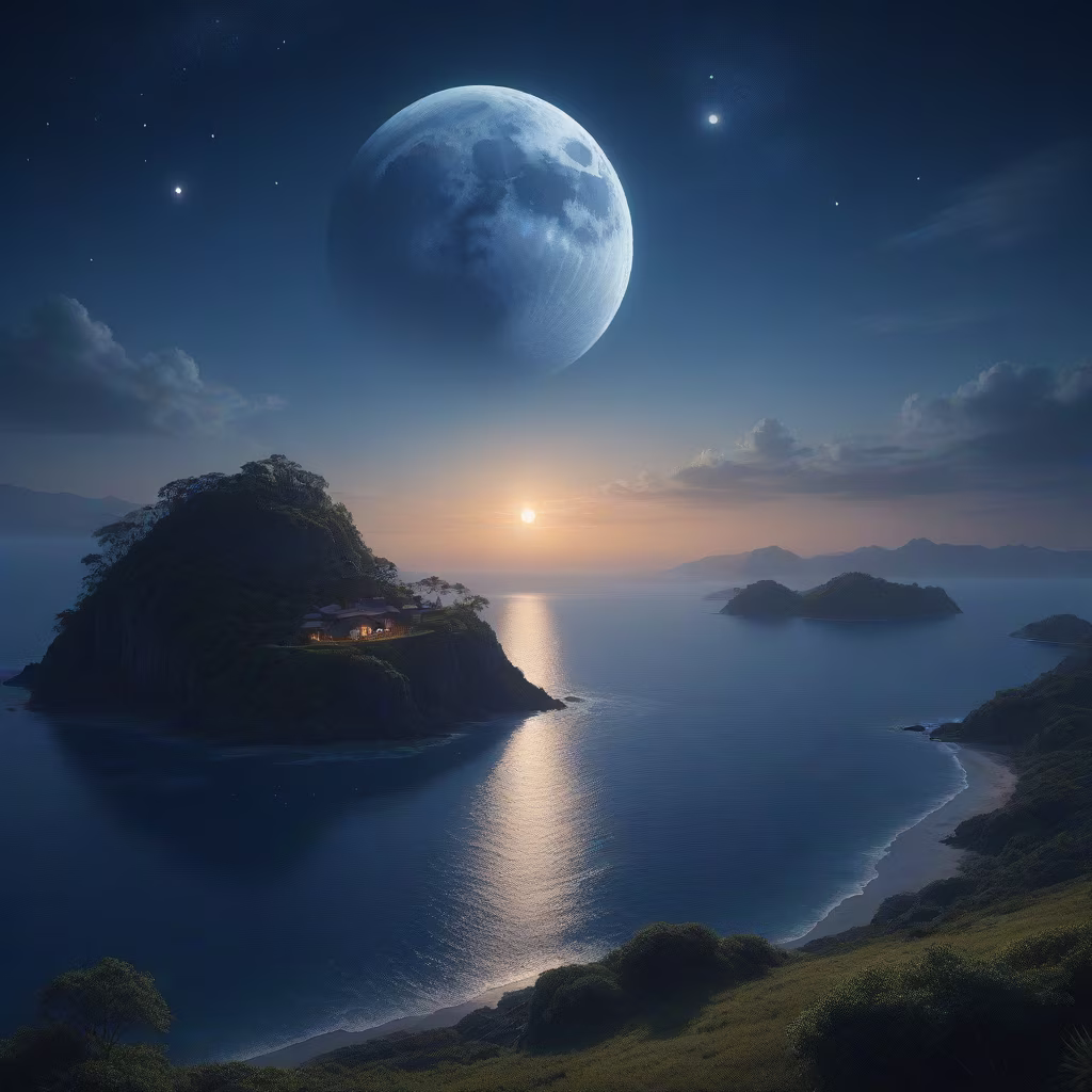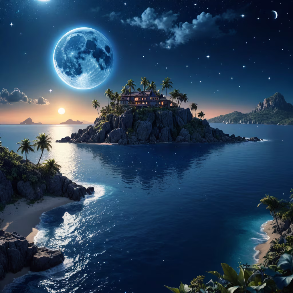 Prompt: A beautiful indigo blue landscape with moon, sun, stars over looking a beautiful island. Epic cinematic brilliant stunning intricate meticulously detailed dramatic atmospheric maximalist digital matte painting