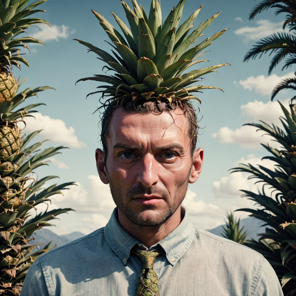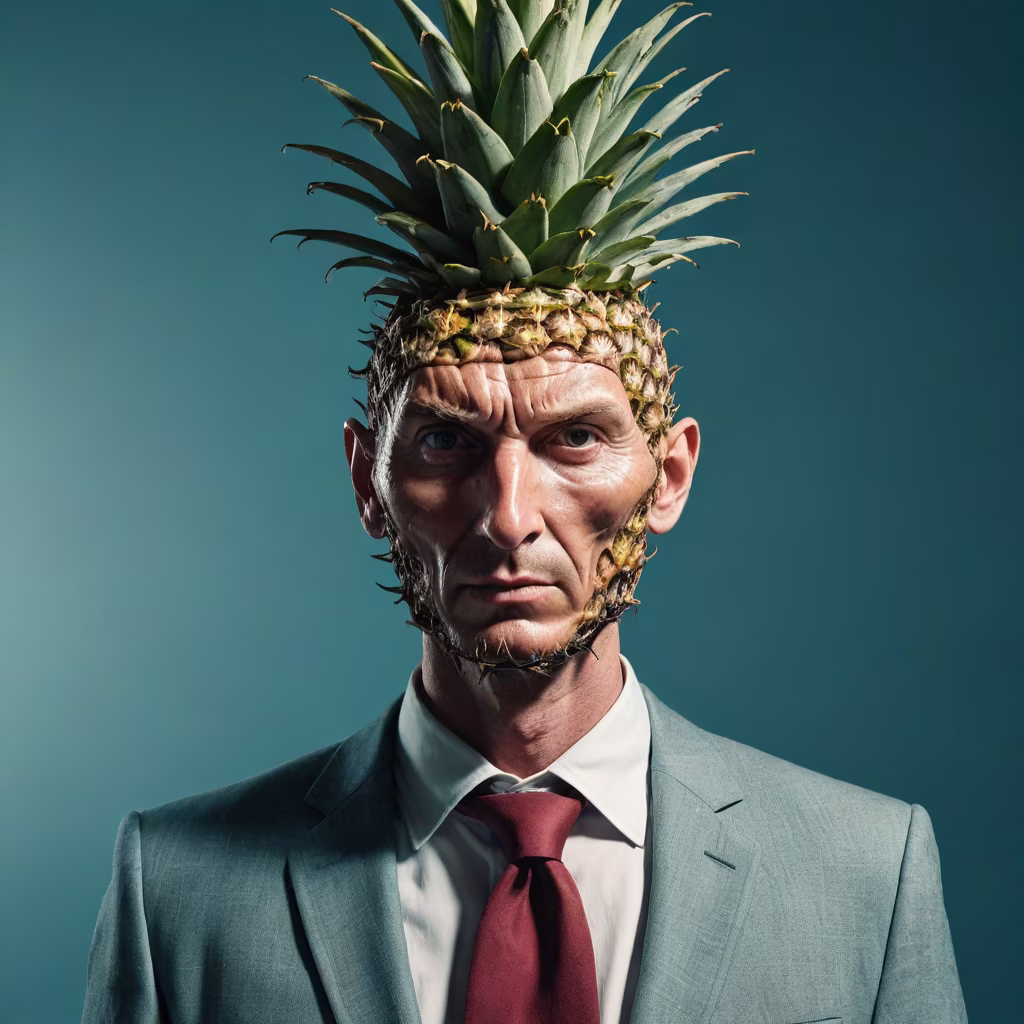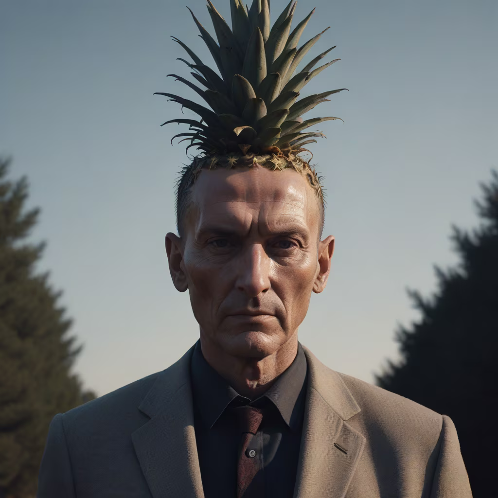 Prompt: A photographic and hyperrealistic cinematic style photo of a man with a head replaced by a pineaple, strange