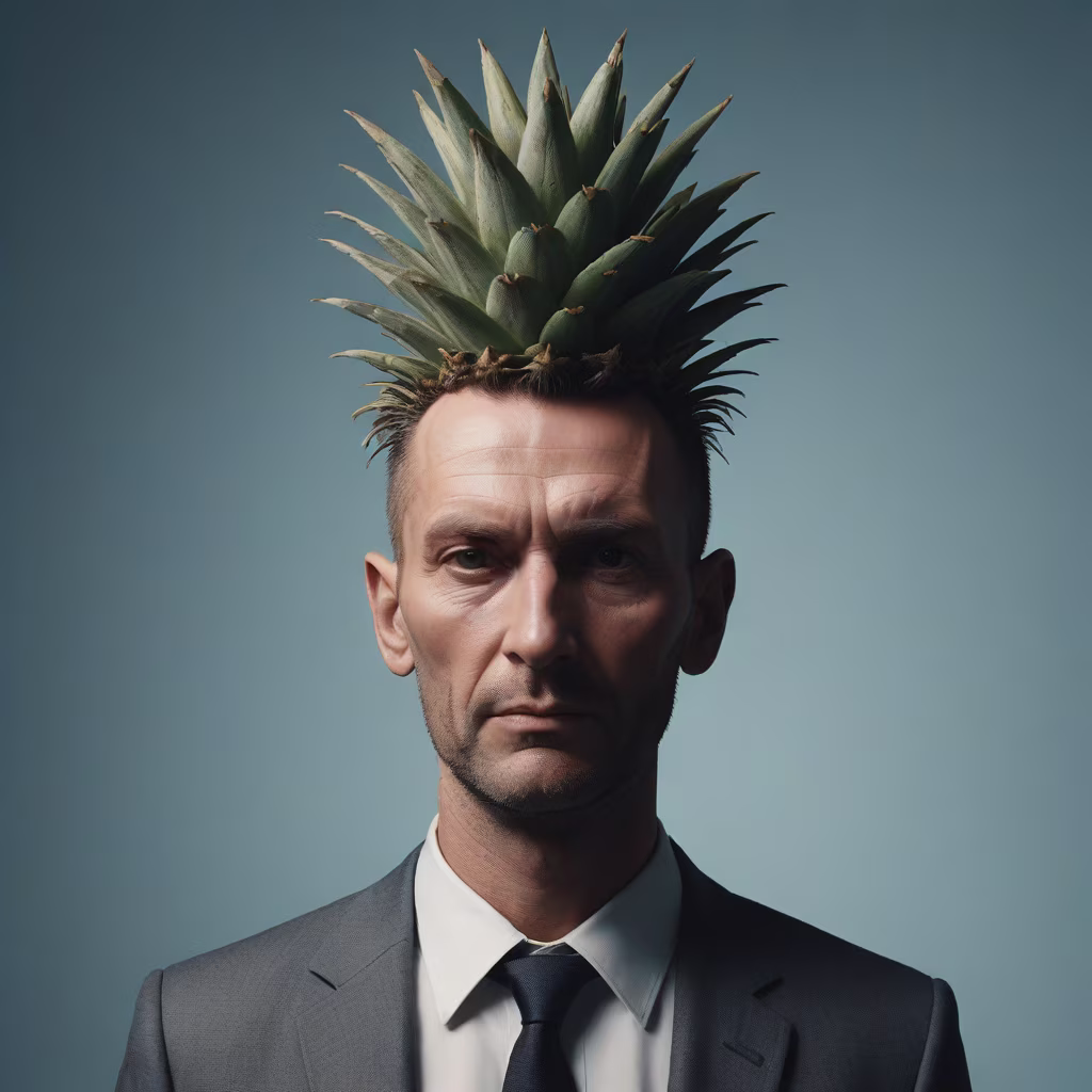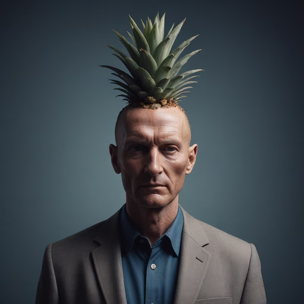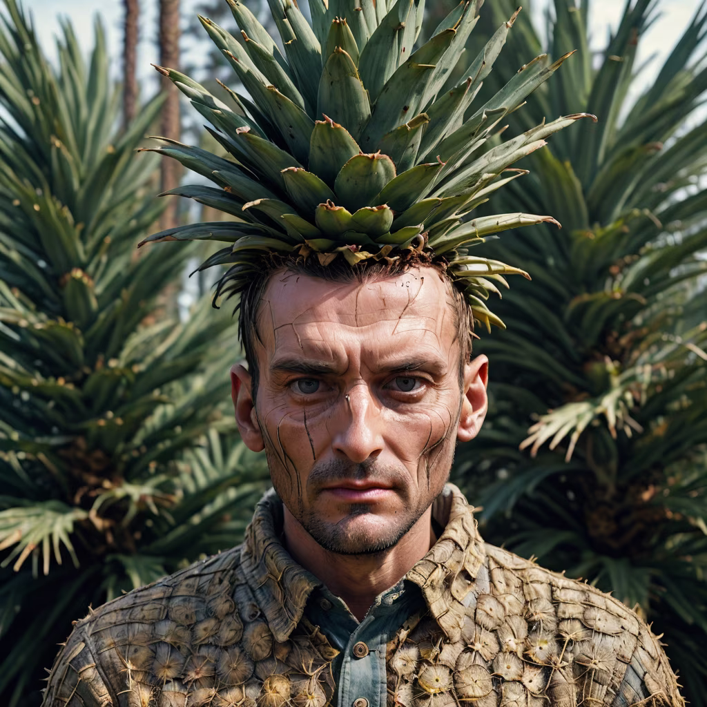 Prompt: A photographic and hyperrealistic cinematic style photo of a man with a head replaced by a pineaple, strange