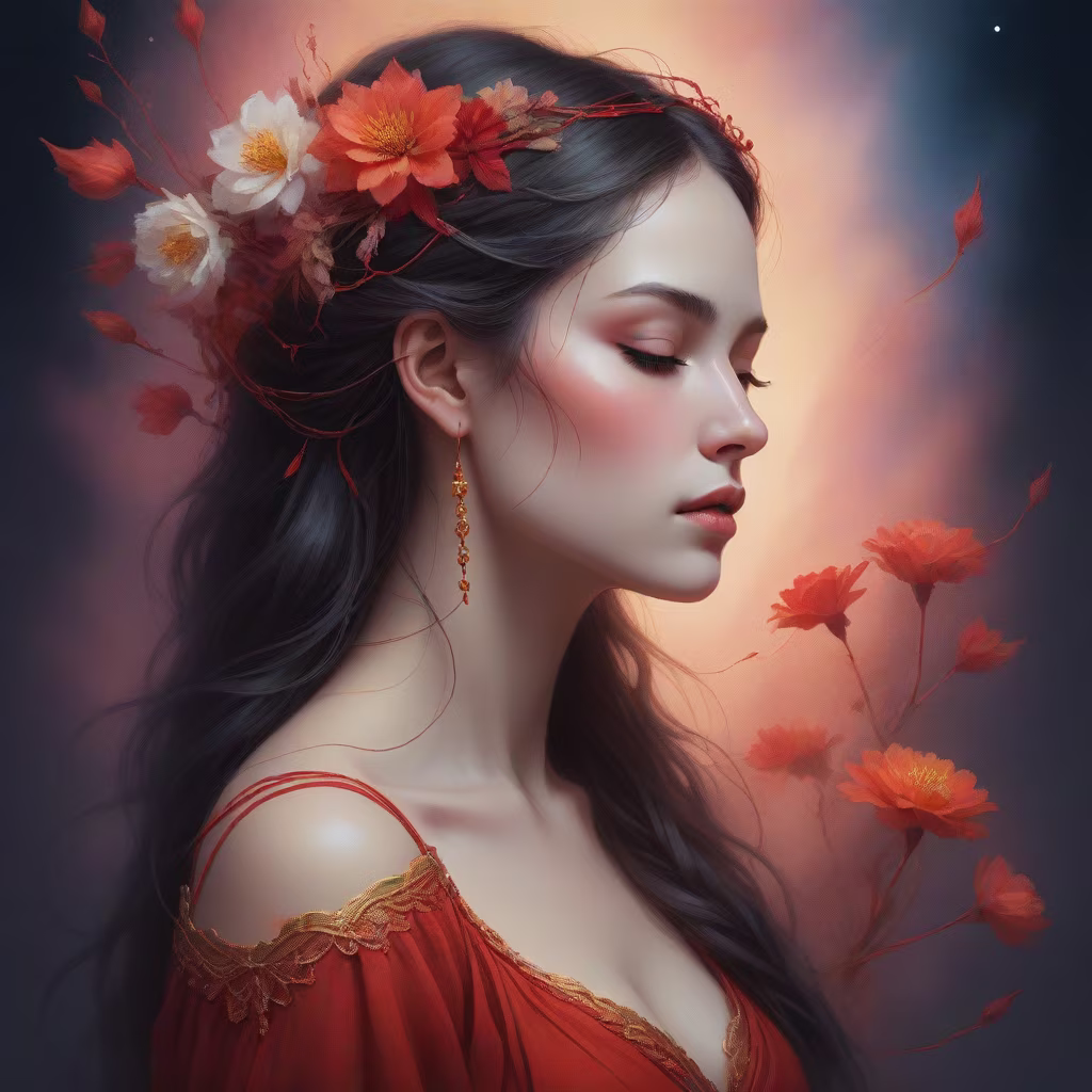 Prompt: Beautiful woman in profile, closed eyes, a red thread stretches from the woman's chest, the woman holds this thread with her hand, flowers around the woman, bare shoulders, lots of details, warm colors, neon colors
