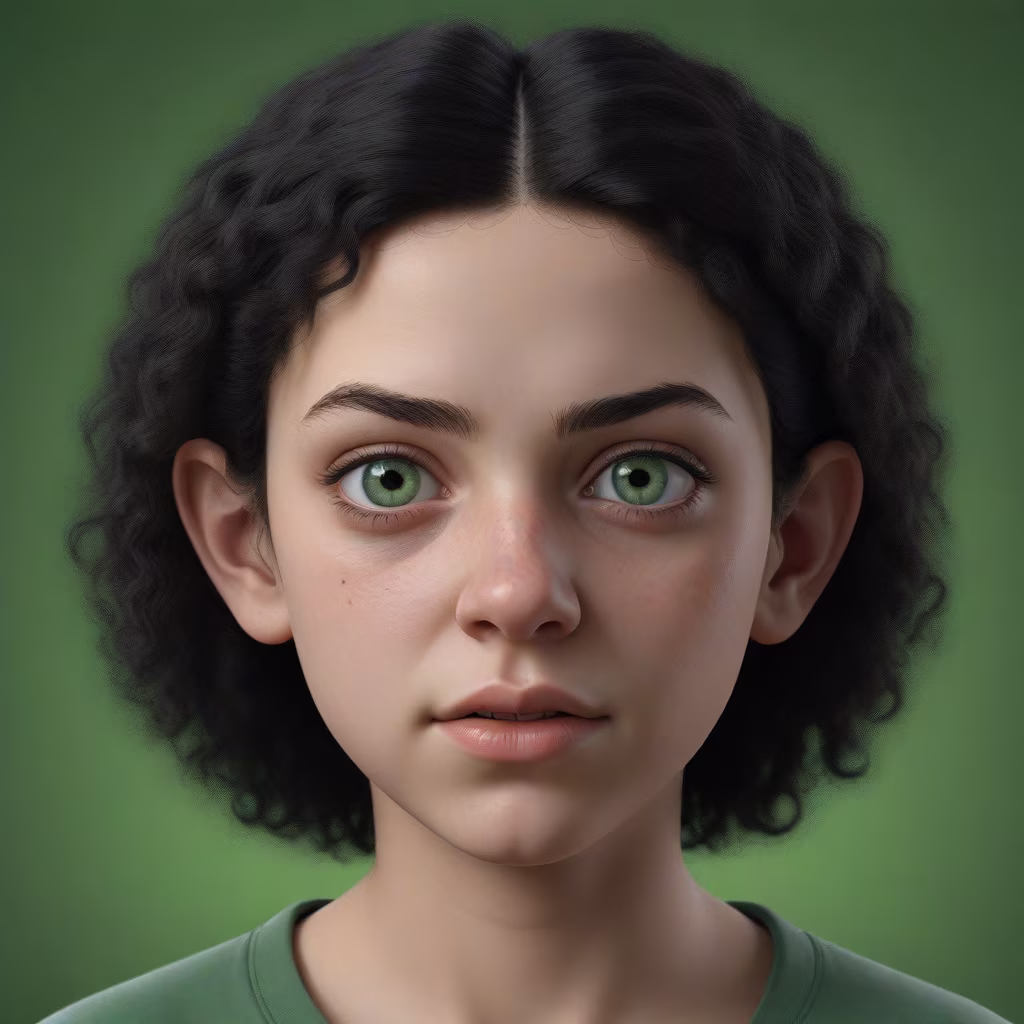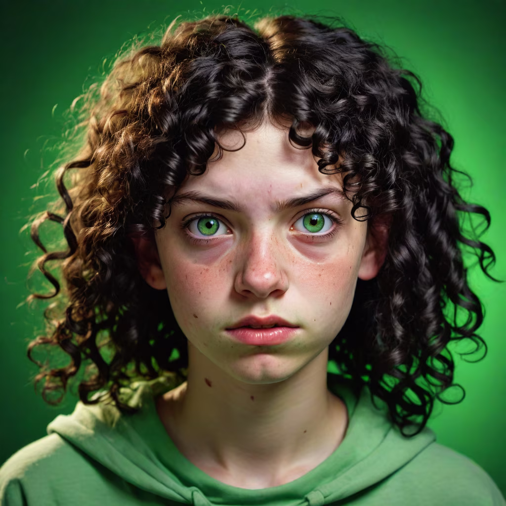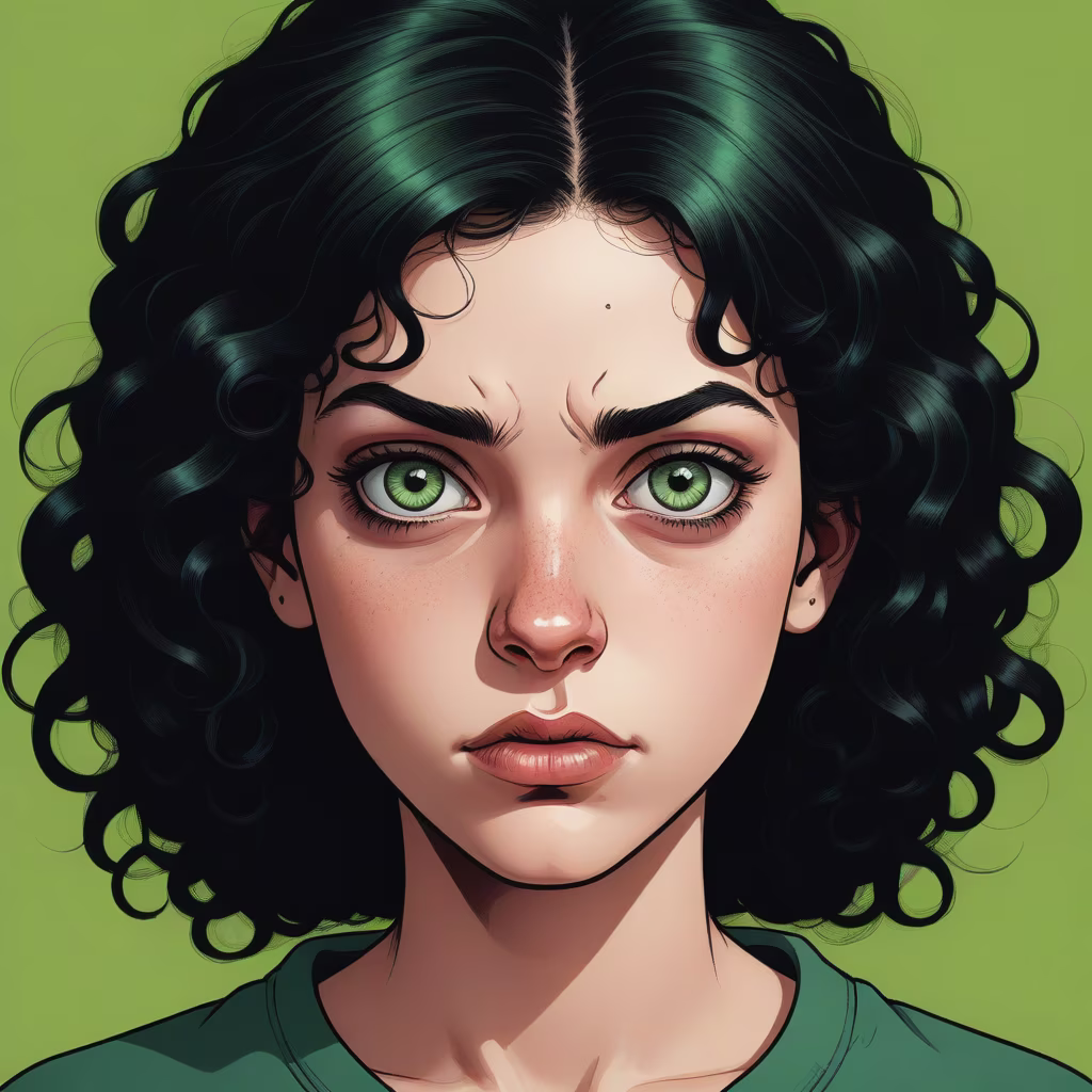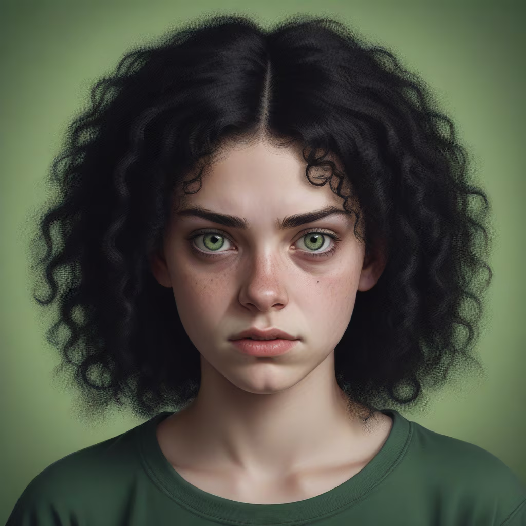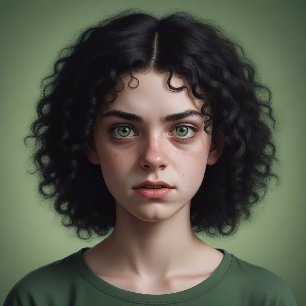 Prompt: realistic portrait of a teenage girl, very ugly, with curly black hair, green eyes, ugly face, evil expression,