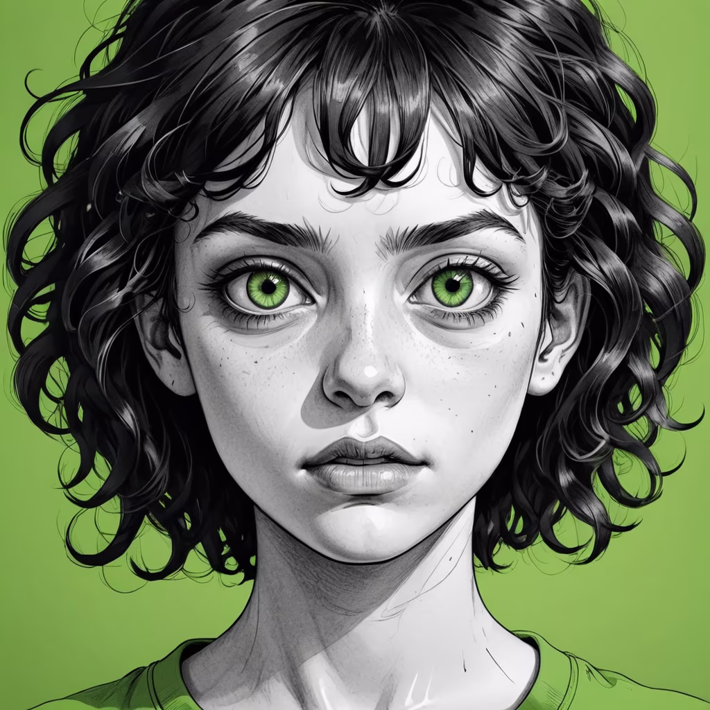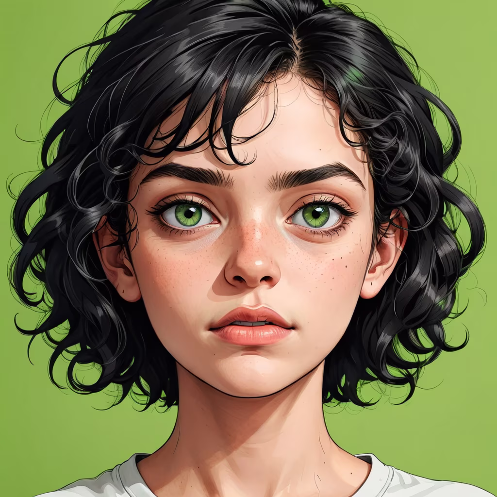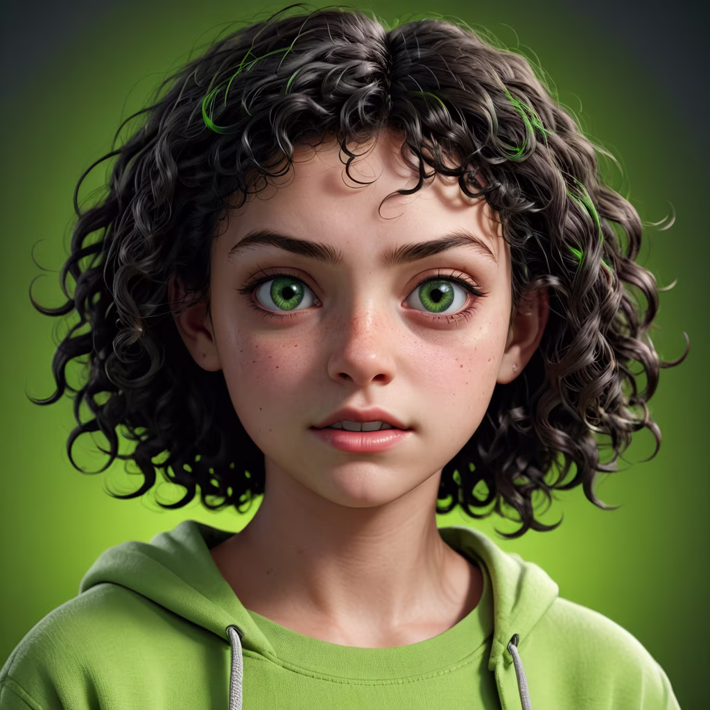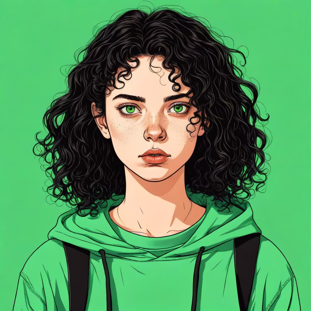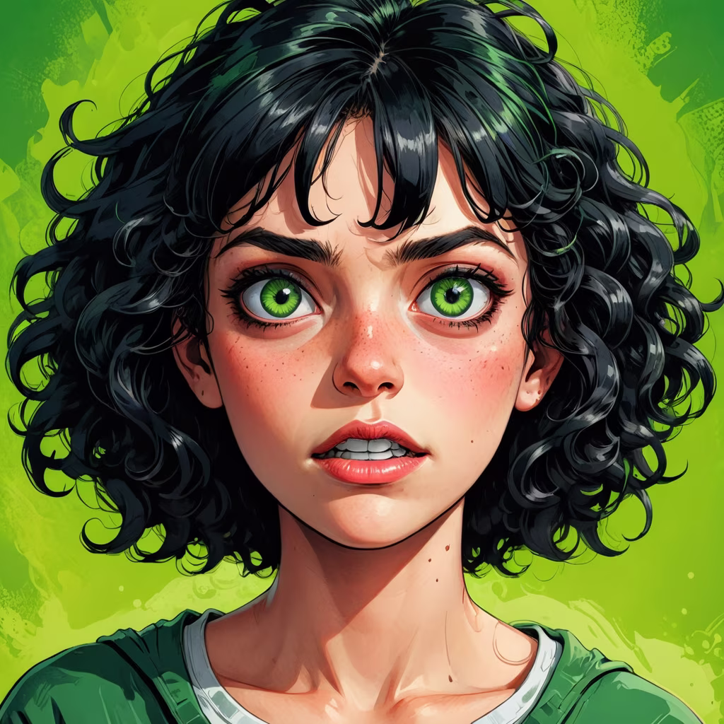 Prompt: realistic portrait of a teenage girl, very ugly, with curly black hair, green eyes, ugly face, evil expression,