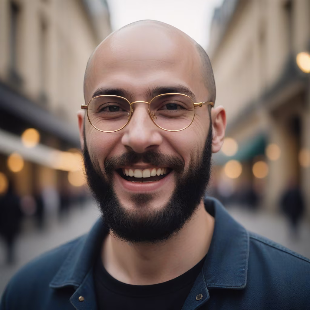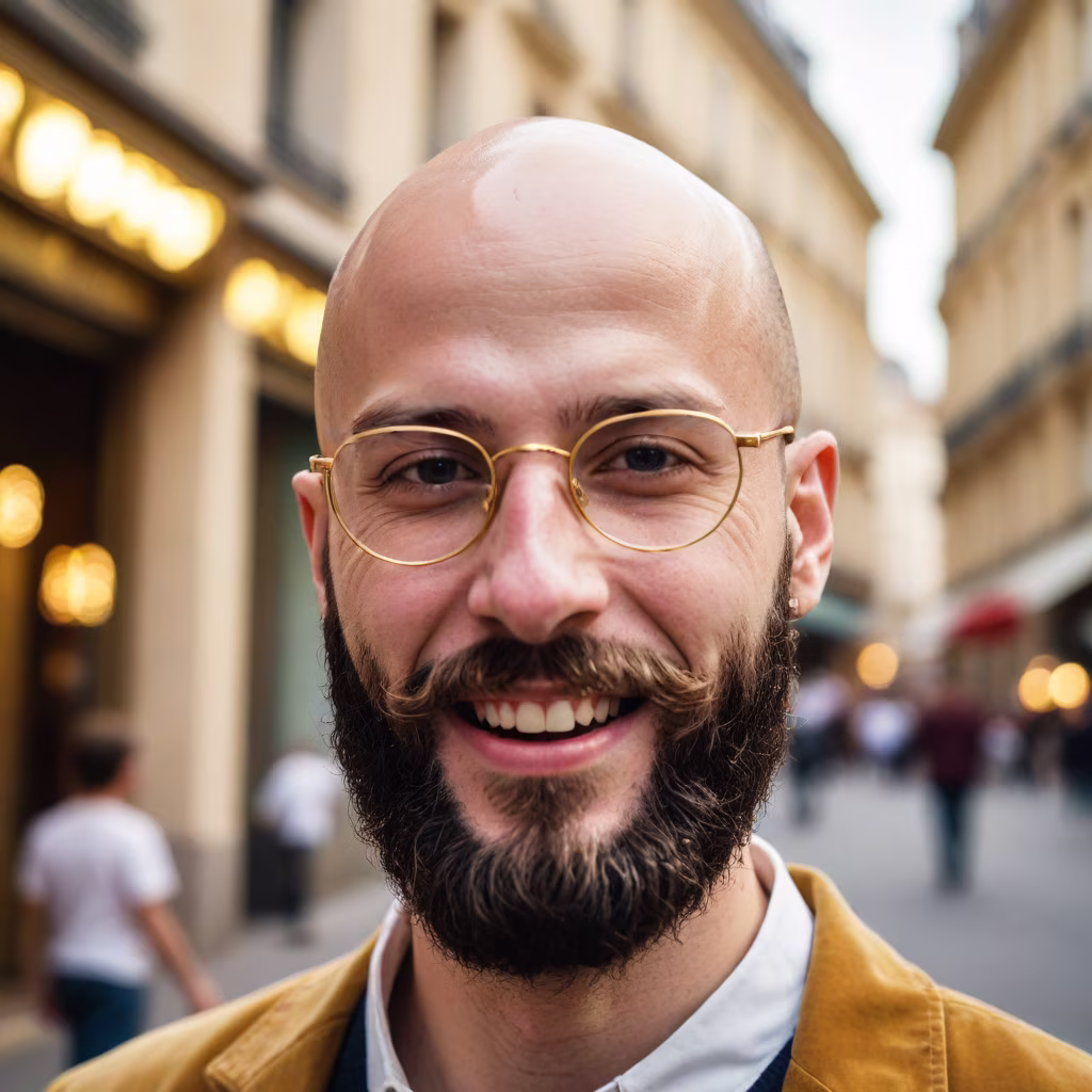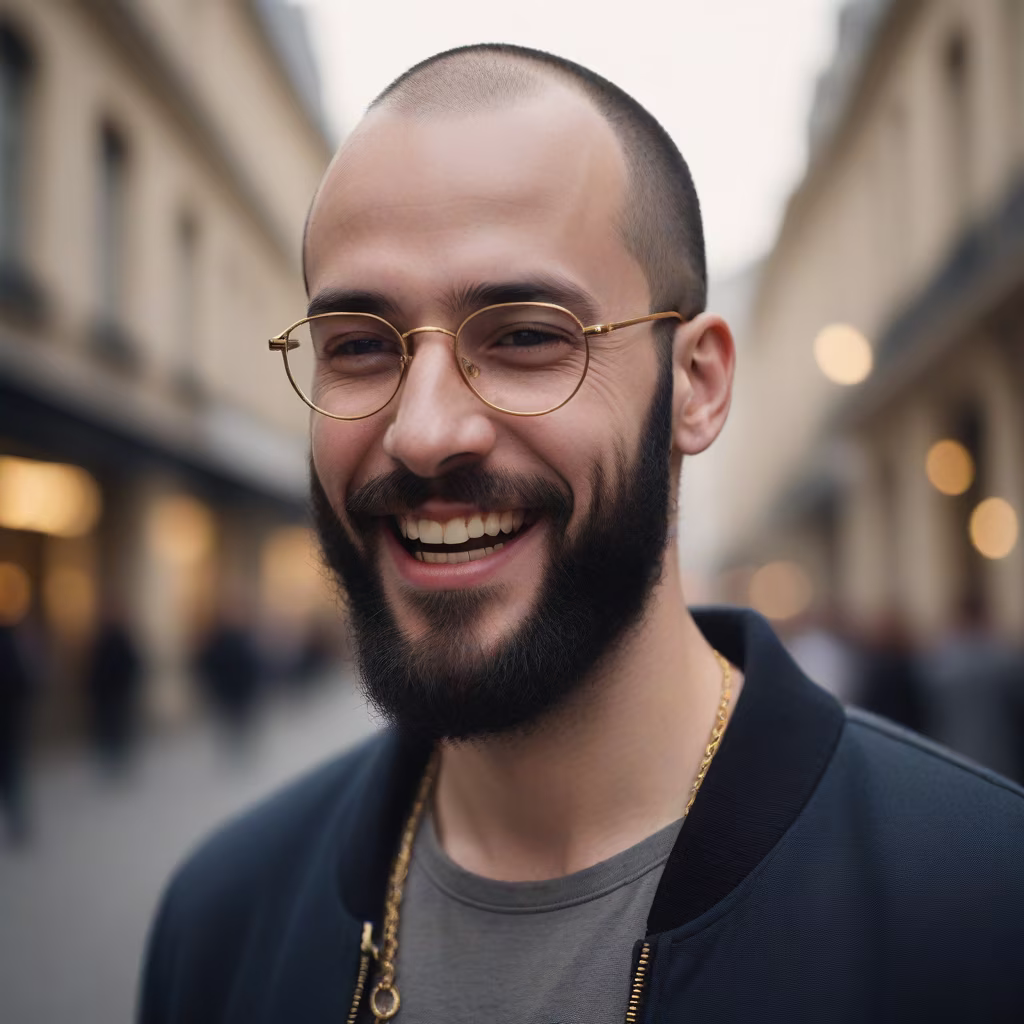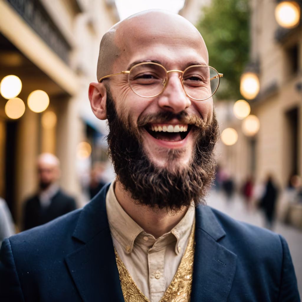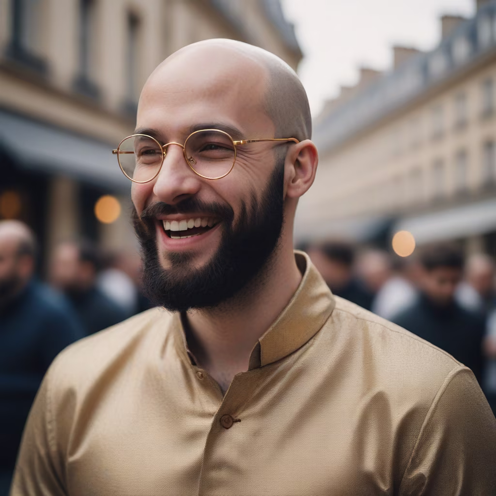Prompt: Generate an image of a french 25-year-old man, bald, wearing golden glasses, and sporting a black beard. The photo should capture the man laughing, in a three-quarter view, looking away from the camera.