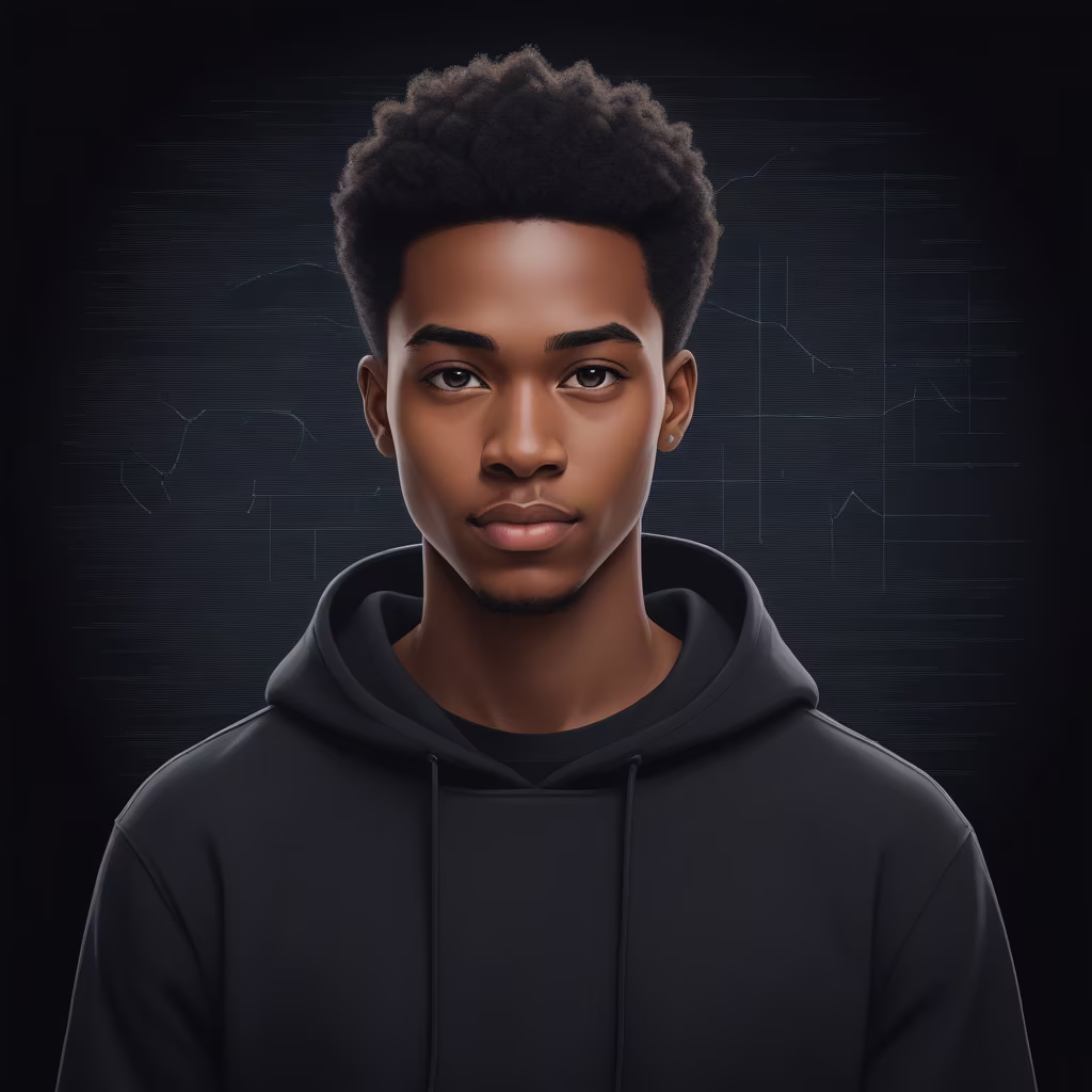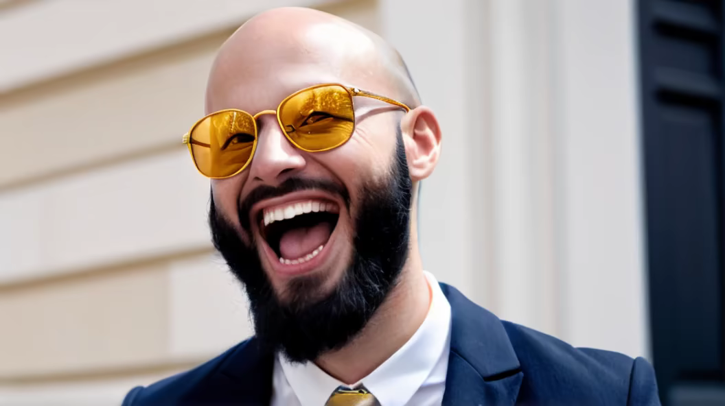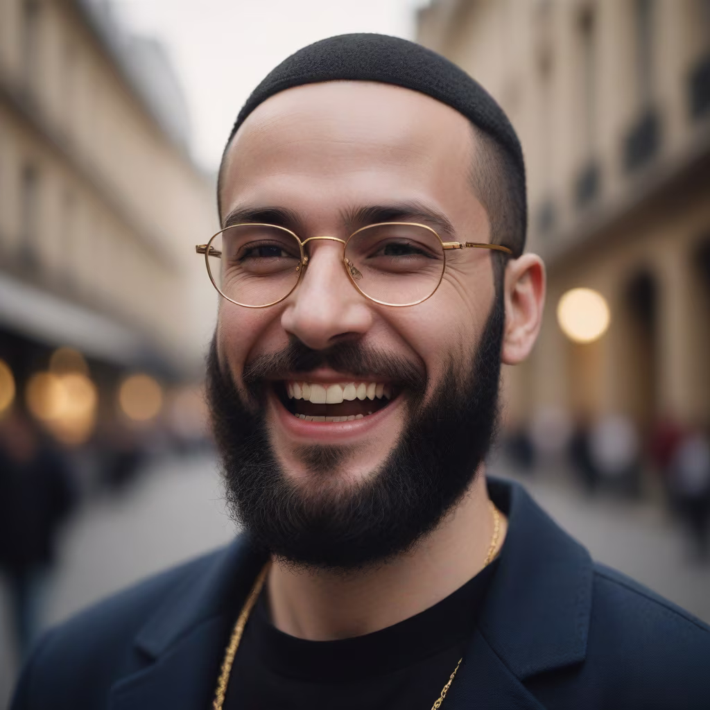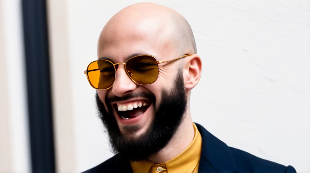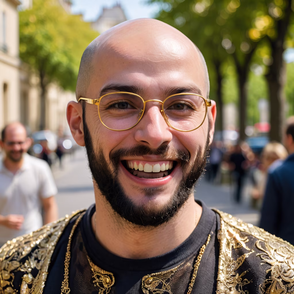 Prompt: Generate an image of a french 25-year-old man, bald, wearing golden glasses, and sporting a black beard. The photo should capture the man laughing, in a three-quarter view, looking away from the camera.
