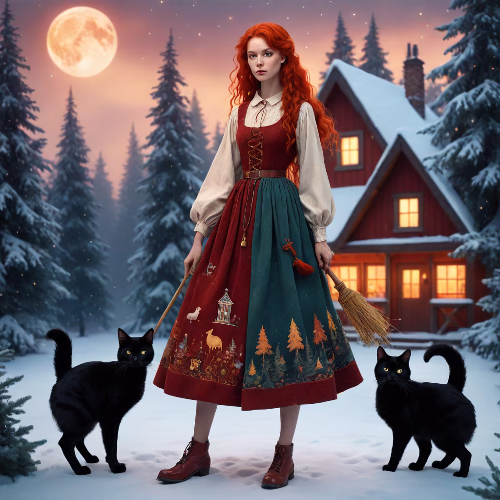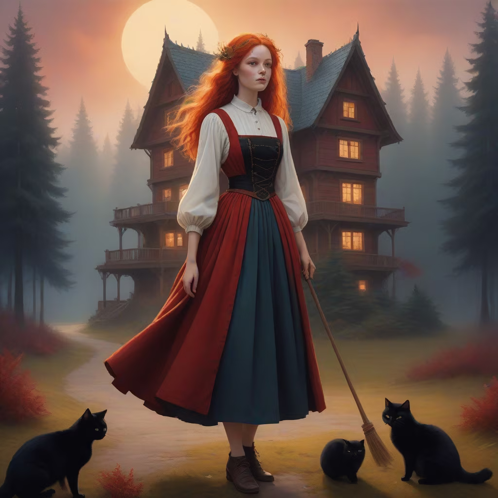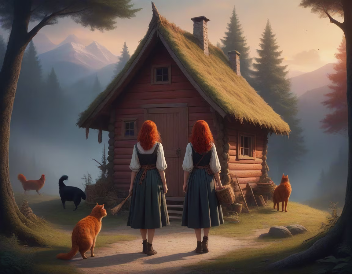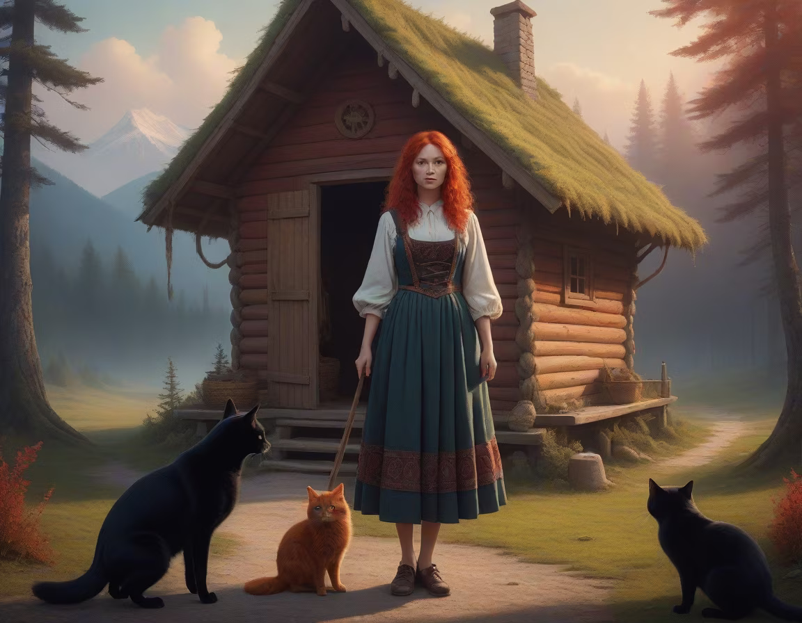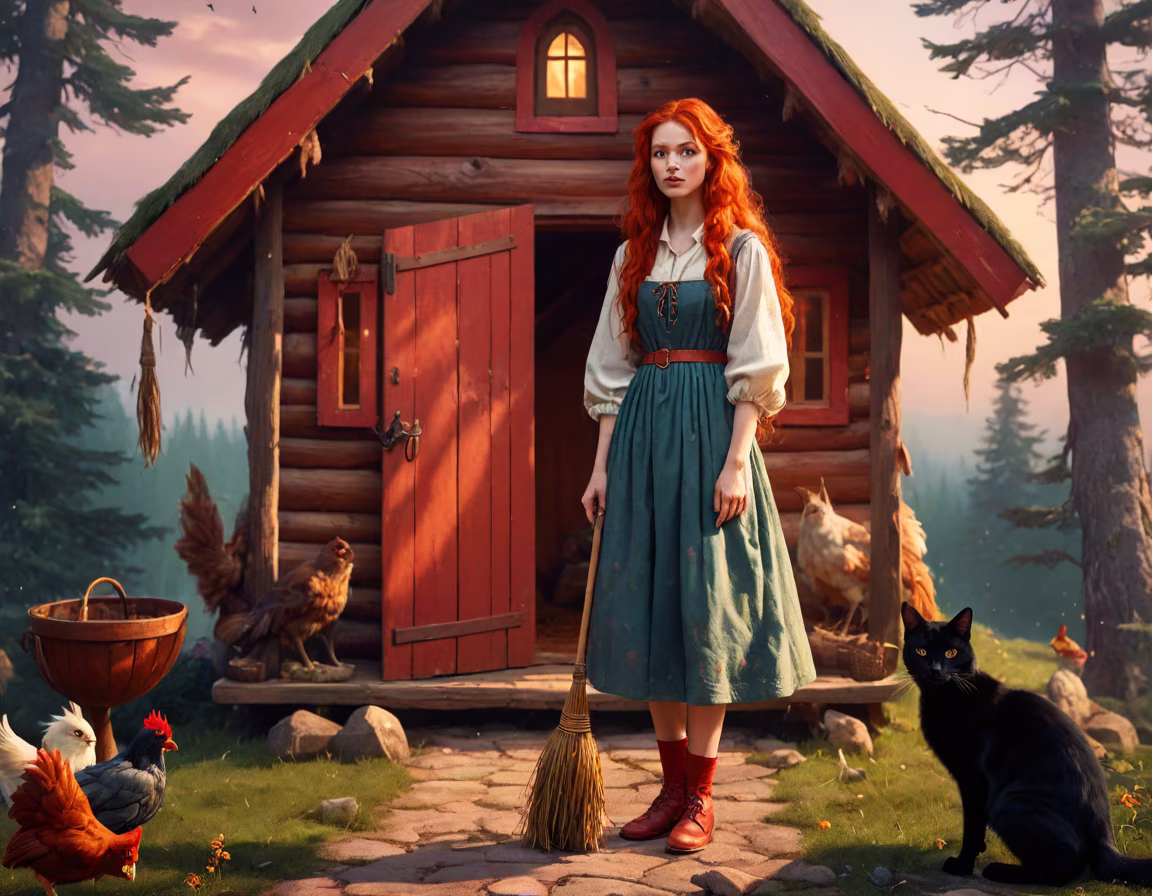 Prompt: House on chicken legs, in the background is a forest of fir trees, stands a beautiful woman with her back to the viewer, Slovian dress, bare feet, red hair, the woman holds a broom and a black cat on her shoulder, lots of details, warm colors