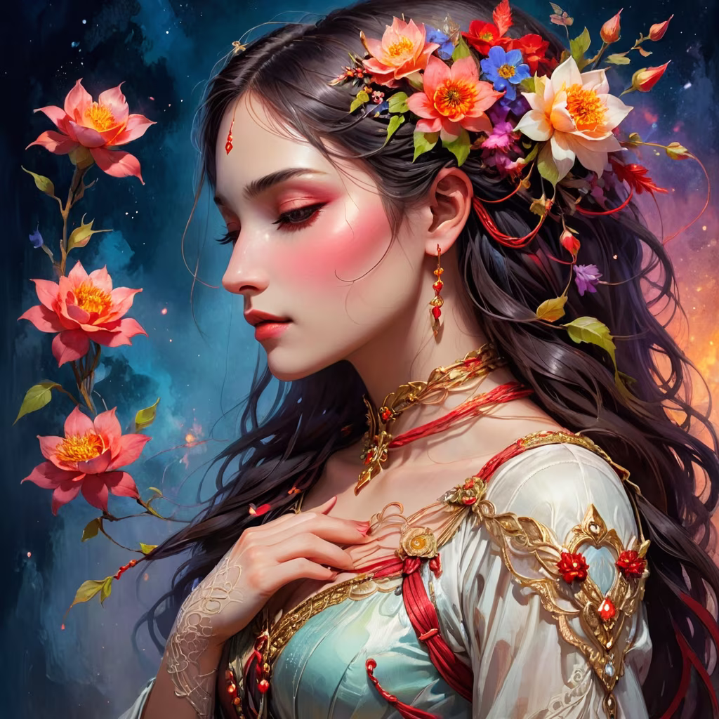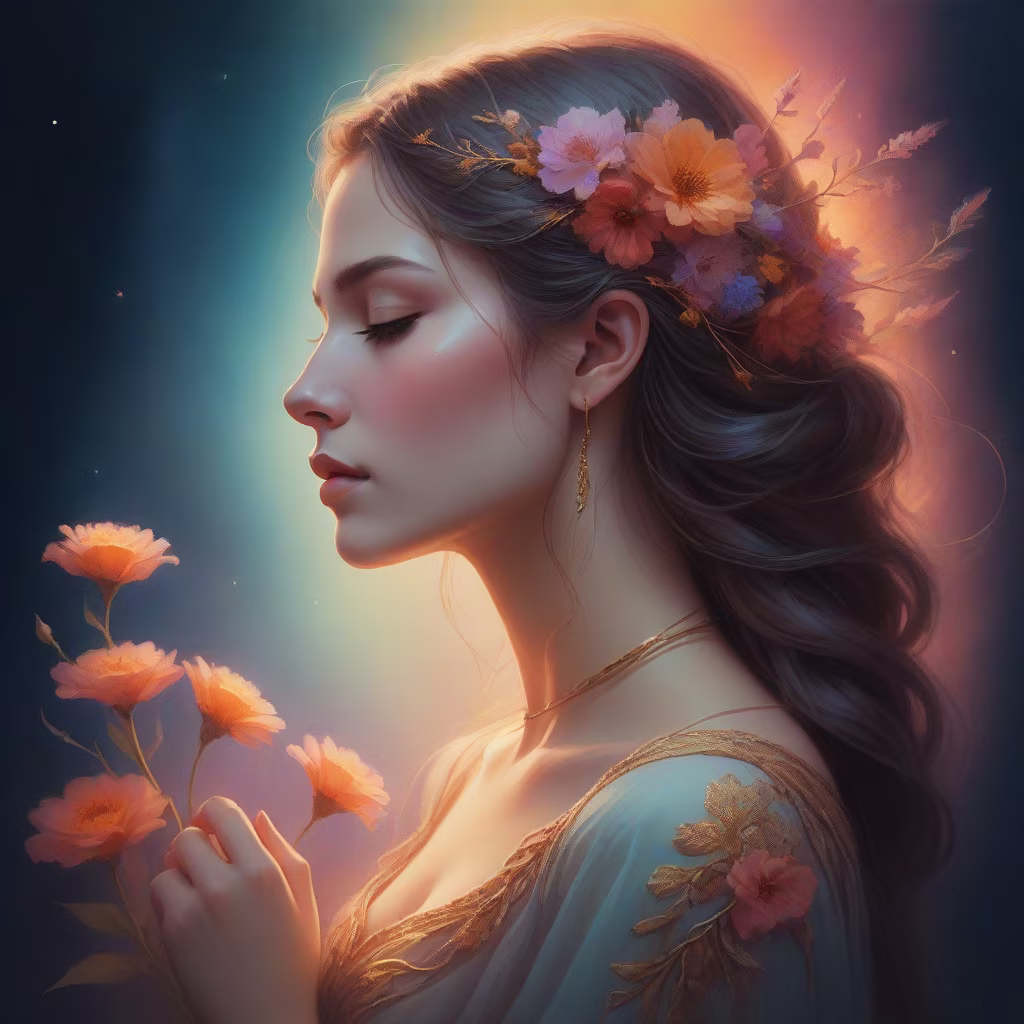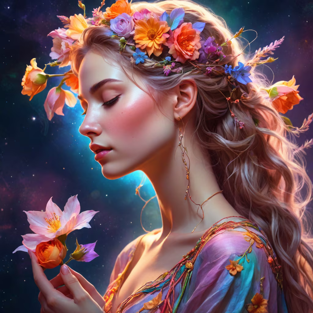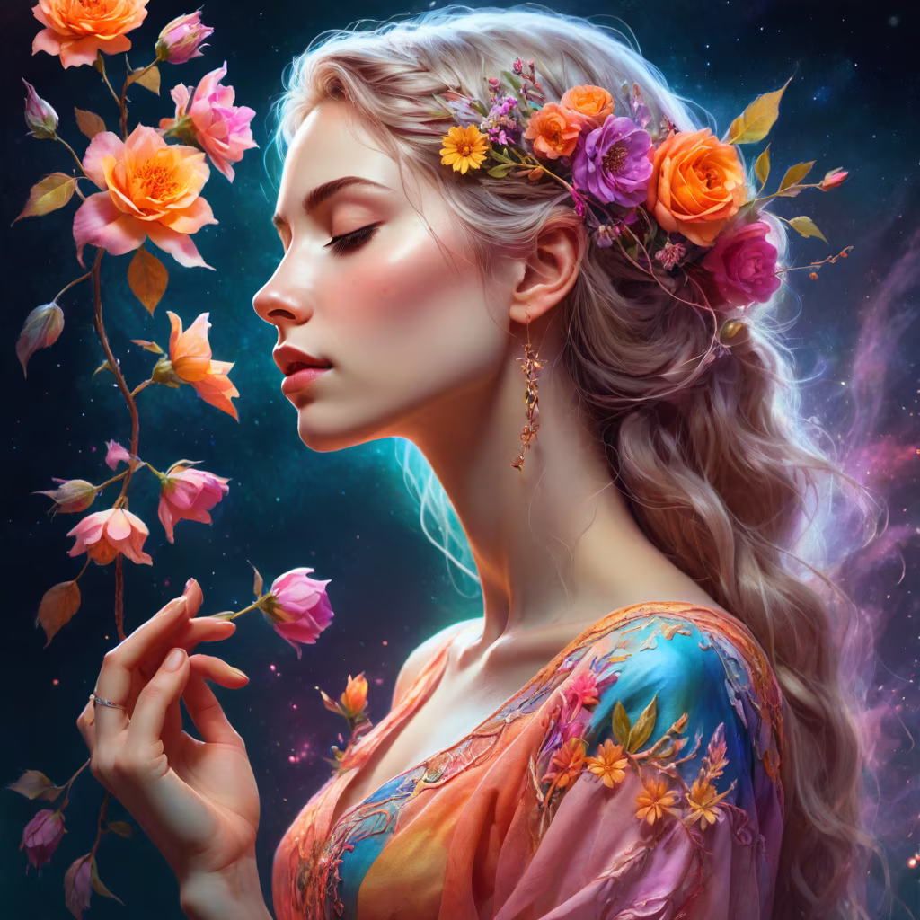 Prompt: A beautiful woman in profile, closed eyes, a thread stretches from the woman's chest, the woman holds this thread with her hand, flowers around the woman, lots of details, warm colors, neon colors
