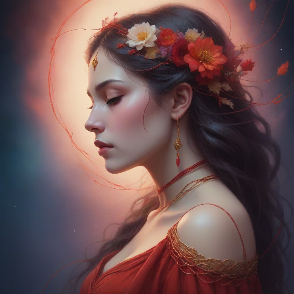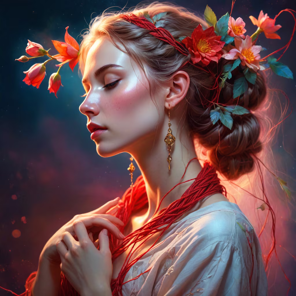 Prompt: Beautiful woman in profile, closed eyes, a single red thread stretches from the woman's chest, this thread is twisted on the woman's fingers, flowers around the woman, bare shoulders, lots of details, warm colors, neon colors