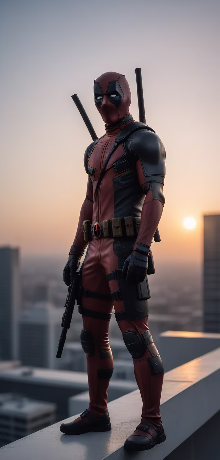 Prompt: deadpool in the top of a building with in the left hand he have a grey gun is it the sunset and he look the photo