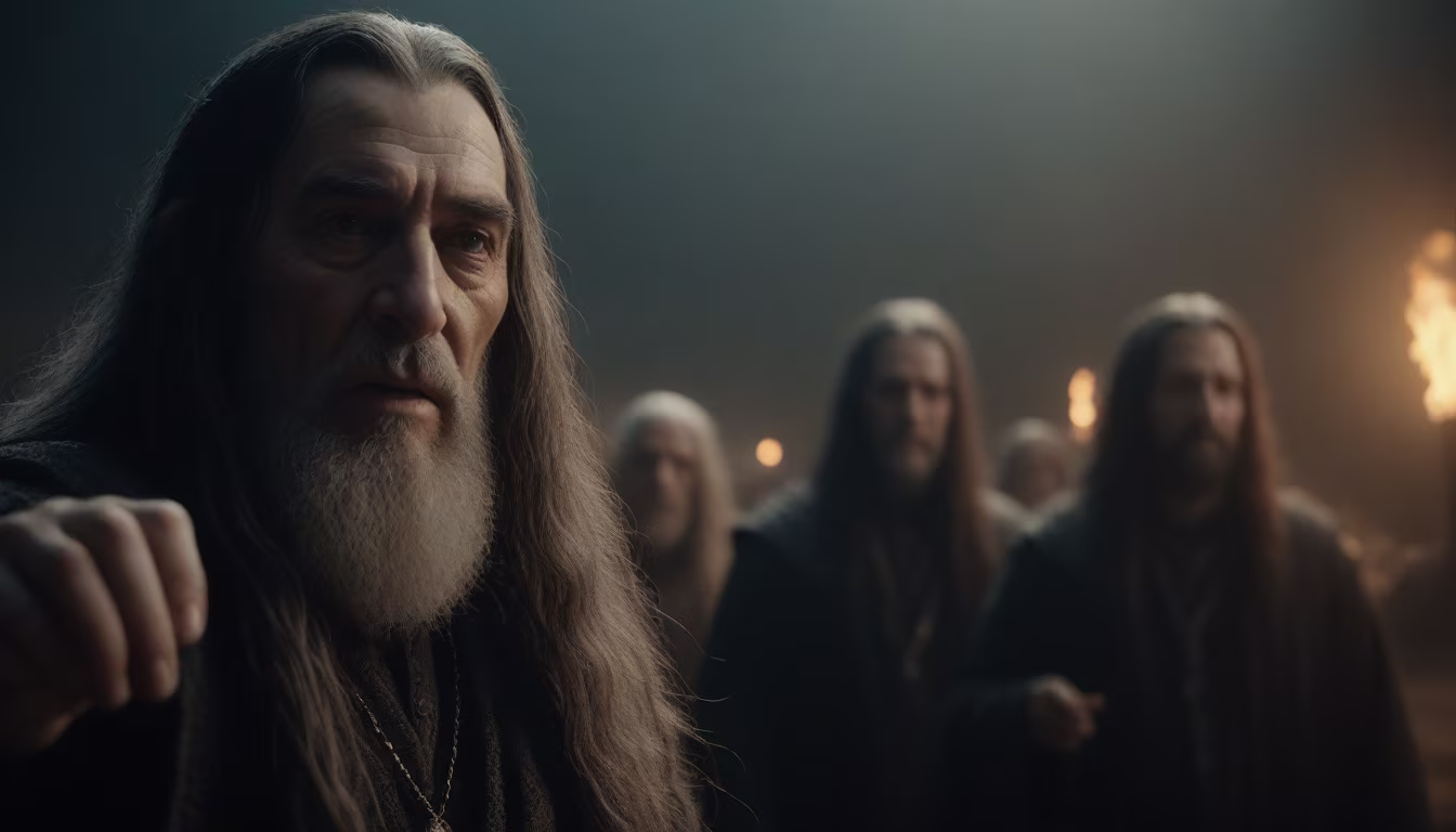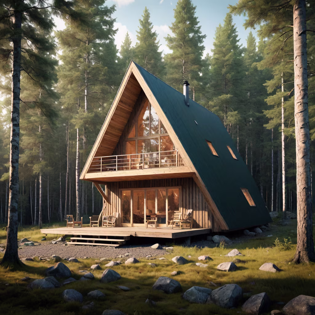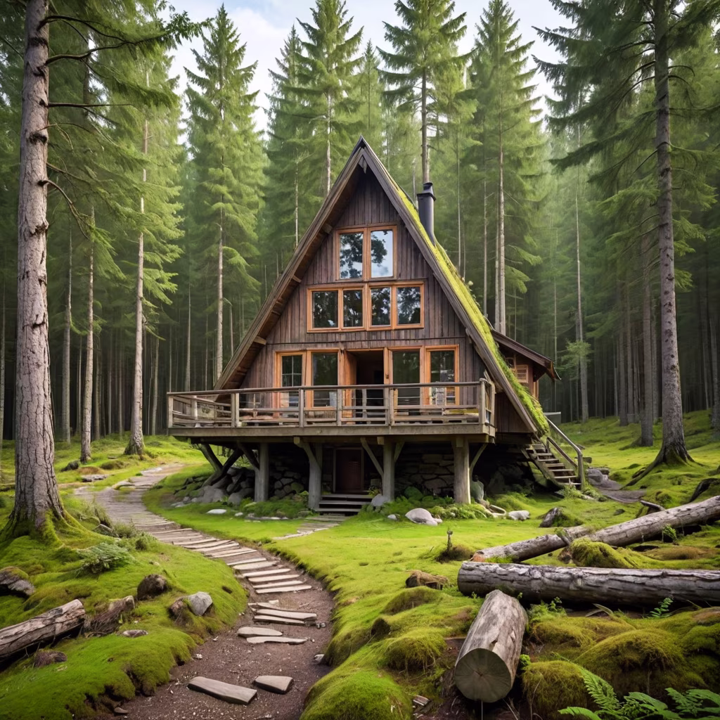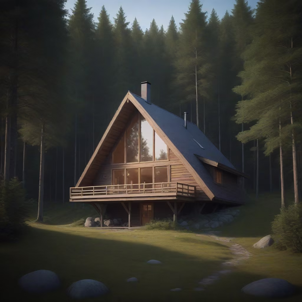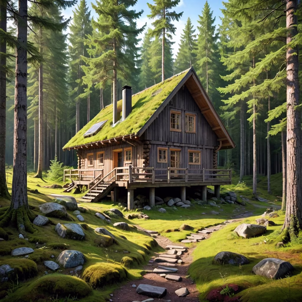 Prompt: On the gentle slope of a lush Norwegian forest, nestled amidst tall trees, stands a quaint wooden cabin. Its triangular structure is supported by four sturdy wooden columns, weathered by the elements yet resilient. As you gaze towards its side, you're greeted by the rustic charm of its architecture, blending seamlessly with the natural surroundings, a serene retreat in the heart of nature's embrace