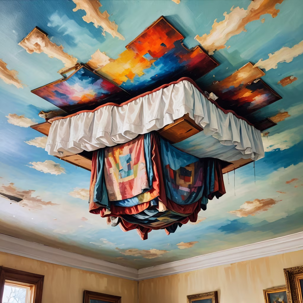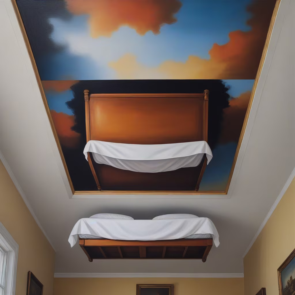 Prompt: An oil painting of a bed upside down, on the ceiling of a house, strange, abstract but coherent, things in the house all put in strange places.