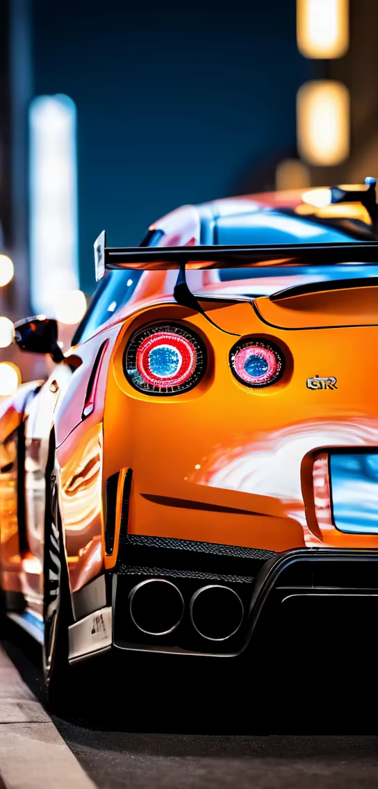 Prompt: car gtr in city in ghe night wee see the back of the car