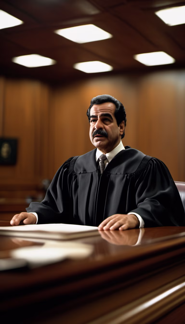 Prompt: Hyper-realistic scene depicting a judge instructing Saddam Hussein to stand up in a courtroom, detailed legal setting, historical accuracy, dramatic lighting, Leica 35mm, ISO 400, f2.8, documentary style,