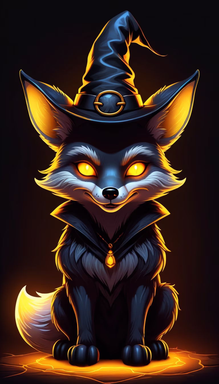 Prompt: a highly detailed colorful dark fantasy art of a spooky, scary, creepy, short, chubby, cute and furry evil demon fox with glowing yellow eyes, witch hat, black boots, isolated on black background, empty scenery, black background, in the style of dark fantasy, dark, gothic, obscure, mysterious, horror, fantasy, mystic, magic, 8k, ultra hd, hdr, trending on artstation, 🎃 halloween 👻