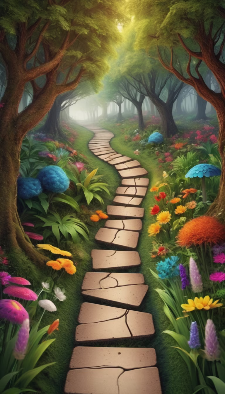 Prompt: One side of the path could be typical and mundane, while the other side is vibrant and fantastical, symbolizing the choice that leads to different outcomes.