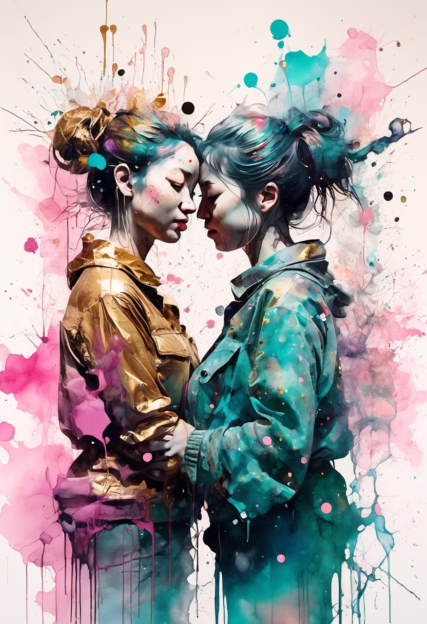 Prompt: Watercolor, alcohol ink, ink blot, dripping paint, Two lone females embracing, kneeling, love, friendship, appreciation, camaraderie, surrounded by geometric golden rings, halos, Alberto Seveso, Agnes Cecille, Ismail Inceoglu, Takashi Murakami, Carne Griffiths, Kawaii, atmospheric, powerful, particles, pinks, teals, blues, swirling smoke and fog