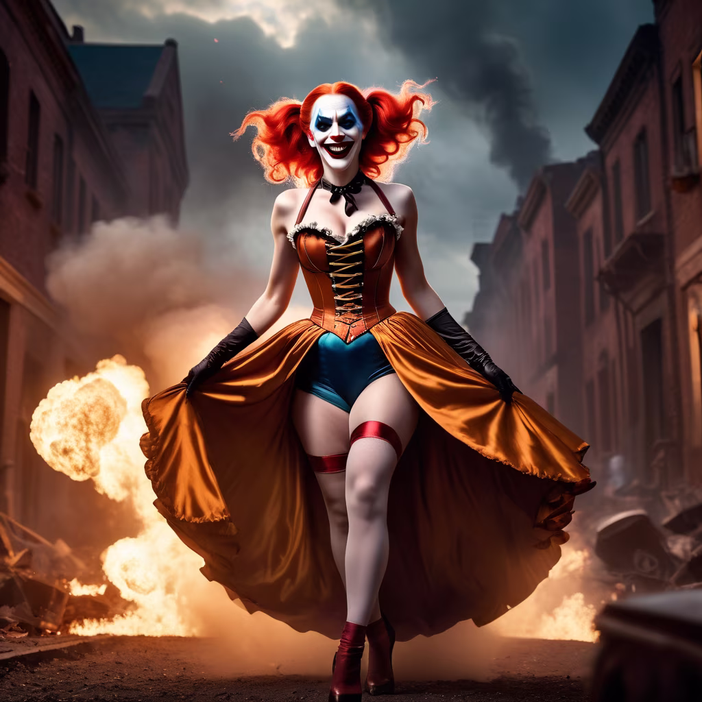 Prompt: wide view of a scary female steampunk joker in painted bride gown in utmost despair, Harley Quinn style, colorful make up, pale white skin, large head, big teeth, grinning scarily, maniac antics, wide mouth, bulgy popping out eyes, super long stretchy arms, super long stretchy legs, long red ears, colorful cloth, mini top, tight jeans, colorful smokes, grotesque , whimsical, unreal deconstructed body, broken bones, super chaotic, the clown jumping and swirling in the air in dynamic motion blur effect, dark and mysterious, dramatically ominous, super wide angle, dark ancient city crumbling slowly in background, super massive explosion in background and massive mushroom cloud, super bright orange backlight, tornado swarming, heavy wind, leaves all over in the air, isolate background, cinematic style, dramatic scene, pop art, pin up, soft shadow, sun shines through, god rays effect, dark and moody style, diode illumination, colorful splash of smokes, matte photography effect, dark vignette around edges, purple and red spotlight, depth of field, 8k, masterpiece quality, overhead view, 360 view