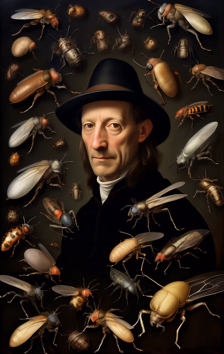Prompt: portrait of a entomologist with a thinking hat surrounded by tiny creepy creatures, by hieronymus bosch, breughel, depth created by escher, surealism, dark, oil paint, minimalism, textured painting, epic light, dark academics aesthetic, surreal, meticulous render, highly detailed, classic oil paint, textured, chiaroscuro, sfumato