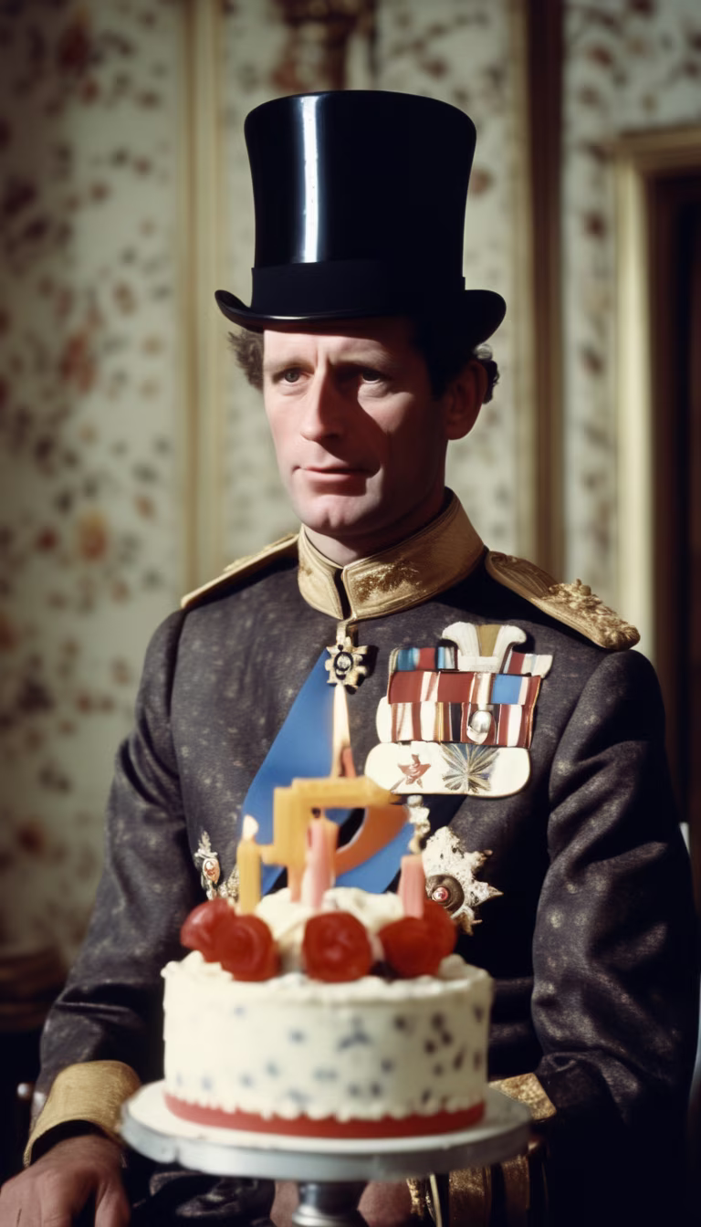 Prompt: Ultra realistic photographic work of portrait of King Charles III of England with birthday cake with the number 75 on it