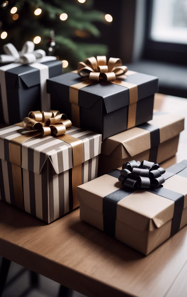 Prompt: three wrapped presents sitting on top of a table, by Nōami, instagram, black and brown colors, streamlined spines, detailed!!, bespoke, stripes, けもの, organic ornaments, 💣 💥, unedited, hay, paper grain, grayish, ios, rectangular, twas brillig, trio, 8 1 5