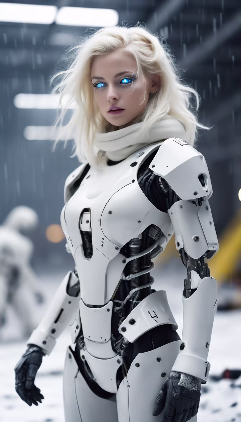 Prompt: wide angle, full view, a cyber goddess in a futuristic snowpunk cyborg suit, fully white exoskeleton cyber skin armour, beautiful face, big bright drop eyes, super fair super soft skin, babyface skin, starstruck, blonde super soft thin white hair. Scene: snowy desert, cold weather, inside an abandoned hangar bay with pale yellow light in the background, some snow from the hard wind blows, there are some other robot scavengers ((very blur)) doing some searching in the background, the hangar is so big it can hold few mega unite robots inside of it. Photography, light bloom effect, some white wash, solar lens flare, dust of particles, soft white shadow, HDRR, Unreal Engine render, anti-alias, masterpiece detailed quality