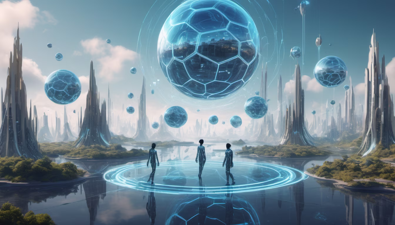 Prompt: Characters immerse themselves in a digital utopia, a vast virtual landscape where AI entities collaborate to create a harmonious world. Floating islands of data and holographic structures symbolize the collaborative intelligence of a benevolent AI singularity.