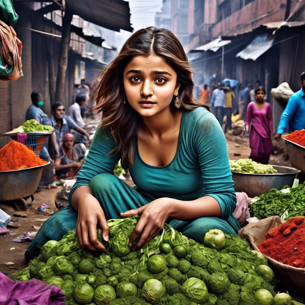 Prompt: alia bhatt selling vegetable in a poor vegetable market in india. dirty street and dirty clothes. Hyper detailed face with 2k resolution.