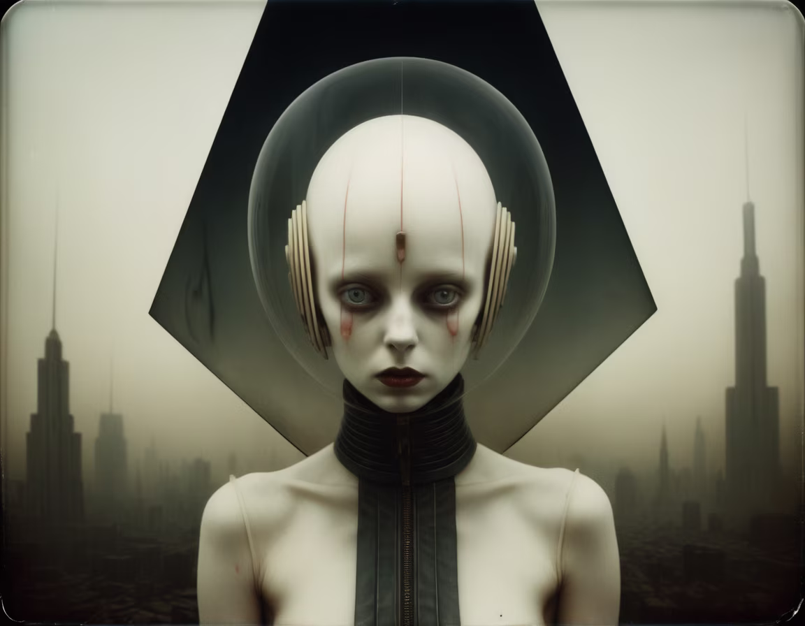 Prompt: ray caesar, Zladislaw Beksiński, michael hussar, Anton Semenov, geometric nightmare, latex, fetish, blade runner, dystopian, 35mm, polaroid, damaged, burned double exposure, chromatic aberration, pop surrealism