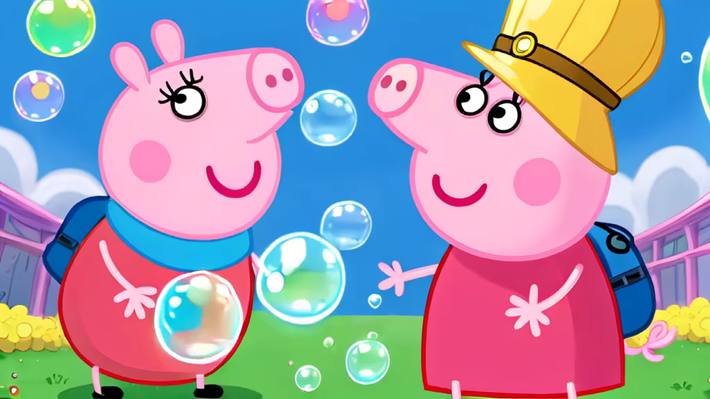 Prompt: Peppa Pig and George see bubbles of different shapes – round, square, and even heart-shaped.