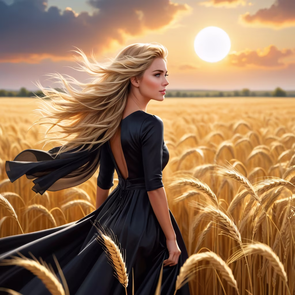 Prompt: Prompt: `A wheat field with tall wheatIn the middle of the field, a beautiful woman in a black dress and loose blond hair Wind is blowing and playing with her hair and moving wheats, is sitting on a beautiful black horseThe weather is sunny and the sun shines in the sky behind the woman's , iso 400, photorealistic, 8k,realistic, (best quality, masterpiece:1.2), highly detailed, ((👫)) by David Mann (The image is digitally painted with a high level of detail and a focus on lighting and textures. It is trending on artstation and has a cinematic quality`