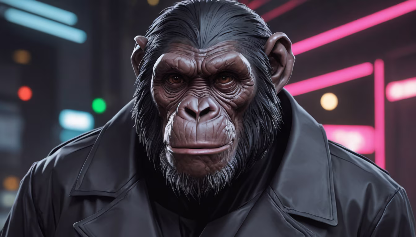 Prompt: 1990s anime sci-fi concept art render, close-up portrait of a cyberpunk space chimpanzee operating in the heart of a neon-soaked noir space-age metropolis. It wears a long black duster coat and is aiming a pistol at the camera, close-up of face of smirking chimpanzee, cyberpunk noir aesthetic, concept character art composition, full body image, plain background by jim starlin, jim Fitzpatrick, Mamoru Oshii, Katsuhiro Otomo artgremlin.