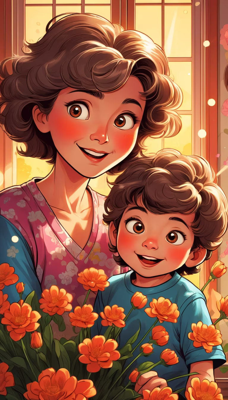 Prompt: Mother's Day poster, cute child gives flowers to beautiful mom with big wavy hair and big sparkling eyes, background in a warm home, perspective, chiaroscuro, warm tones, bright background