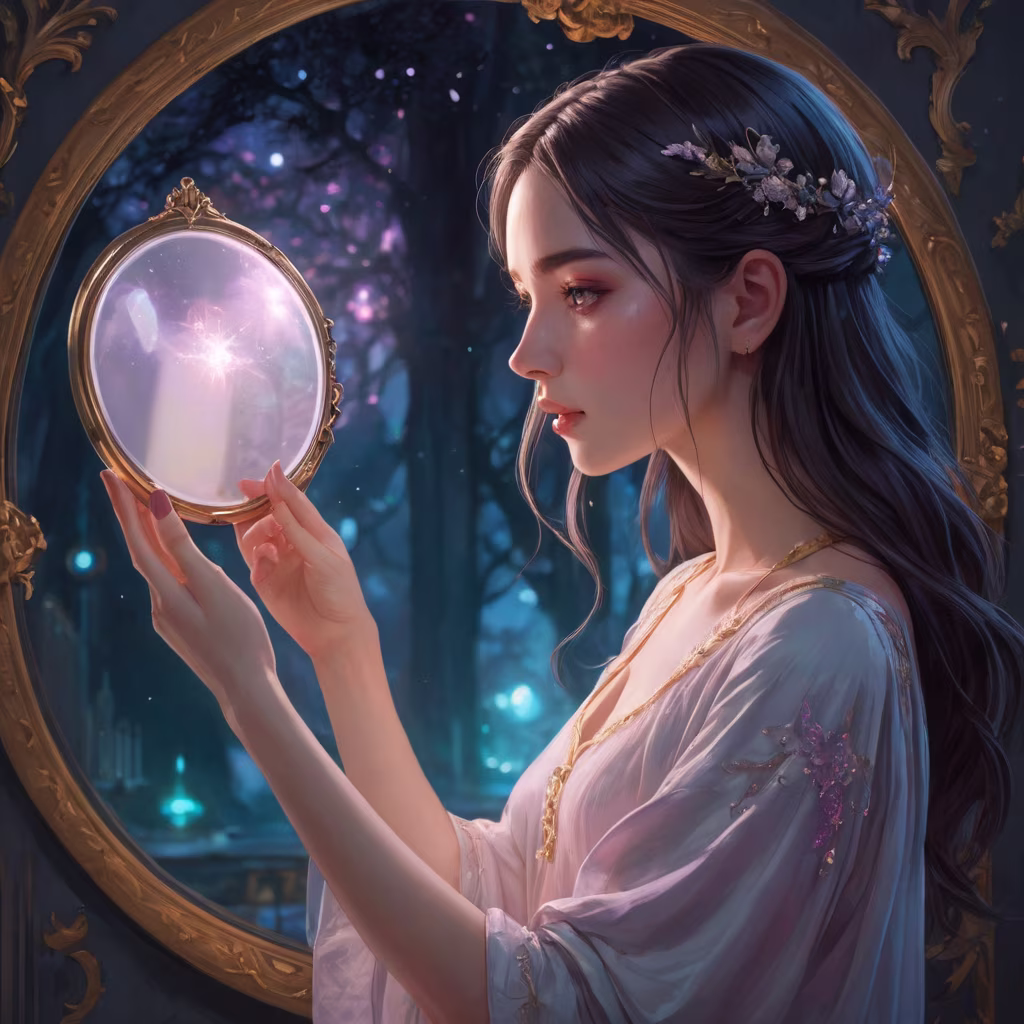 Prompt: Girl holding a mirror with a handle in her hand and looking into this mirror, girl in profile looking into the mirror, neon colors, anime style