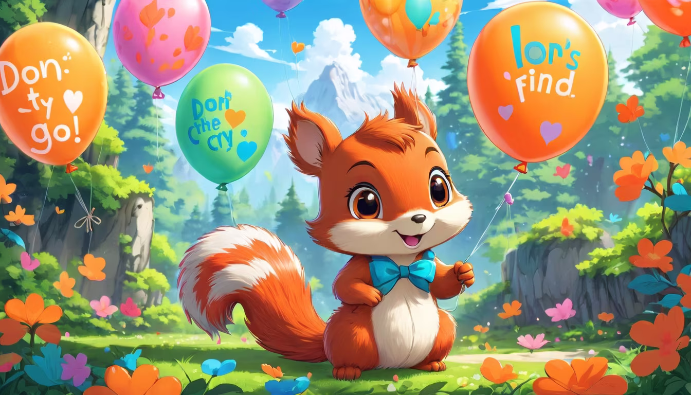 Prompt: Kind-hearted little squirrel Little Gray saw it and held Little bear Orange's little paw, saying, \"Don't cry, let's go find the balloon together!\"