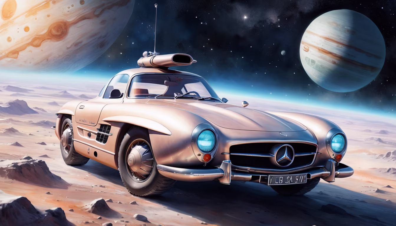 Prompt: Spaceship inspired by Mercedes 300sl fully HD detailed fotting in space jupiter in the background