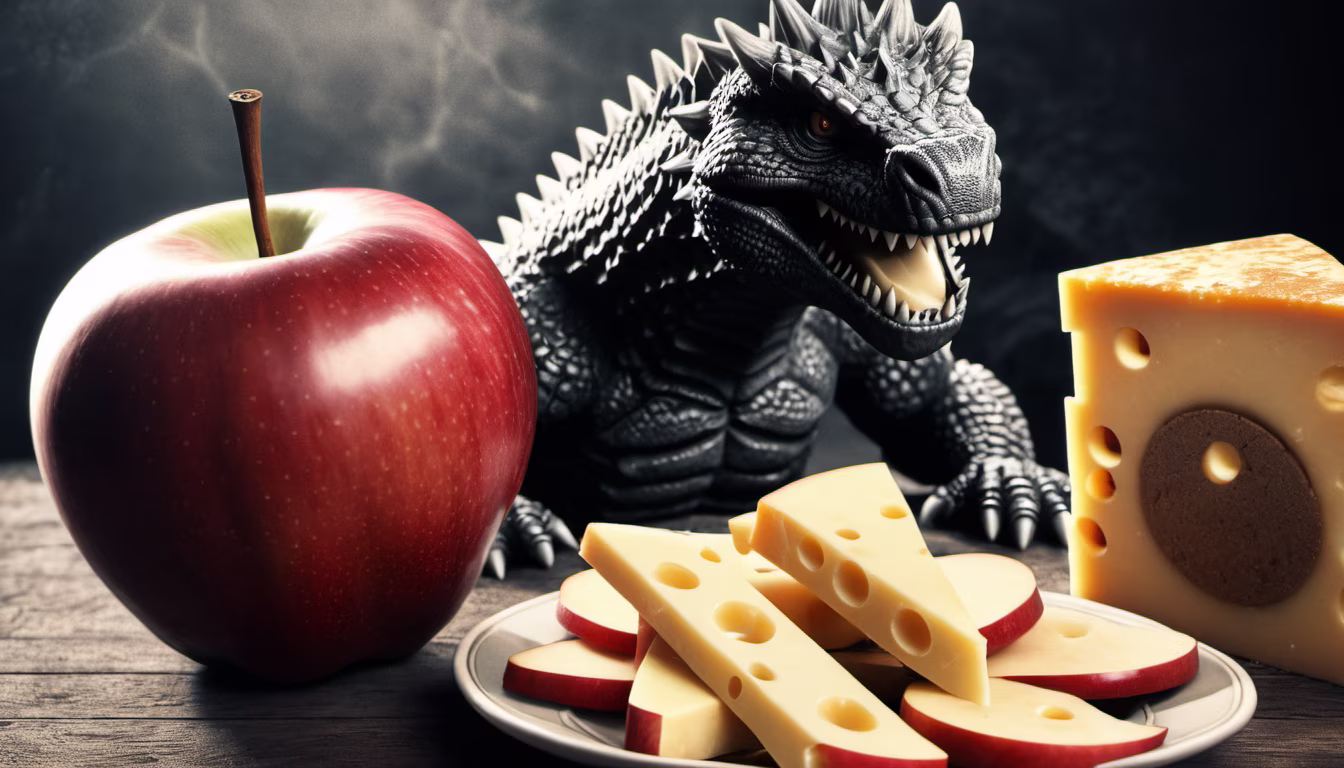 Prompt: Apples, cinnamon, cheese slices, tiny bomba video game character, psycho trippy lsd art, scary Godzilla in the background