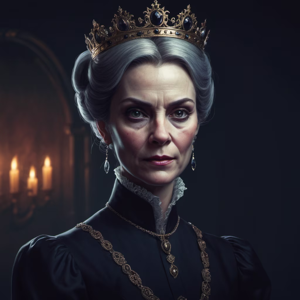 Prompt: evil character,A girl with a mysterious aura, adding some totems on her face to make her more fierce,dark tone,Headband angle not big,the main colors are black, and the eyes shinning,logo