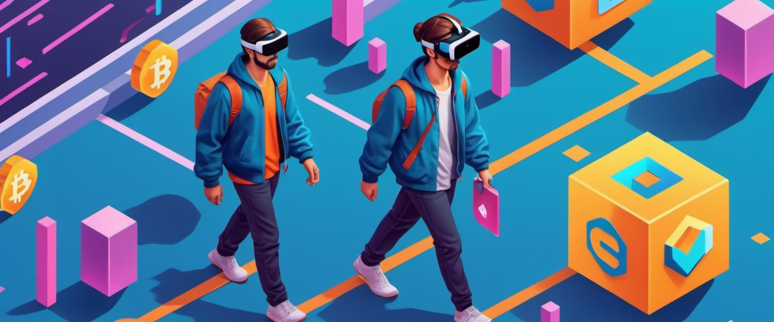 Prompt: Gamer walking into a digital world with nfts and crypto currency as clouds
