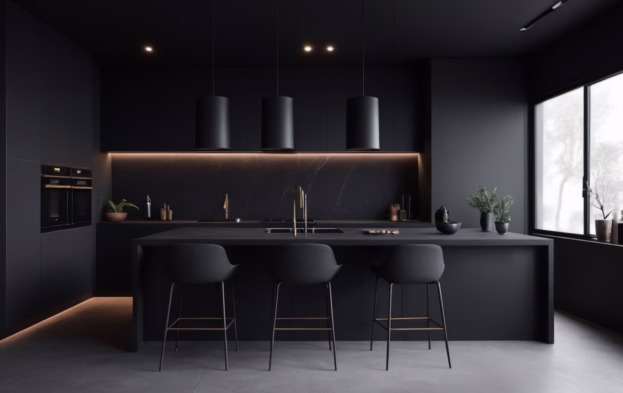 Prompt: interior kitchen minimalist, the subdued dark interior integrates seamlessly with the expansive space