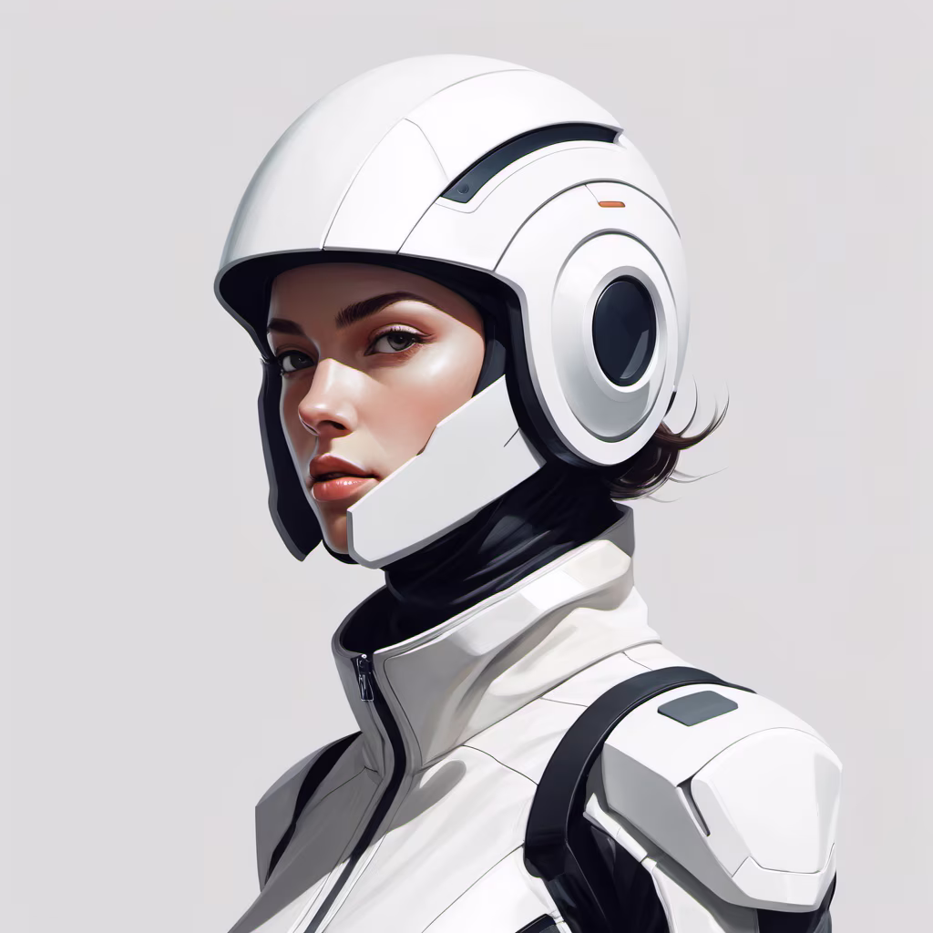 Prompt: A sci-fi character design, minimalist painting, in the style of Olivia De Berardinis, white background, simple shapes, clean lines, futuristic outfit, helmet, minimal details