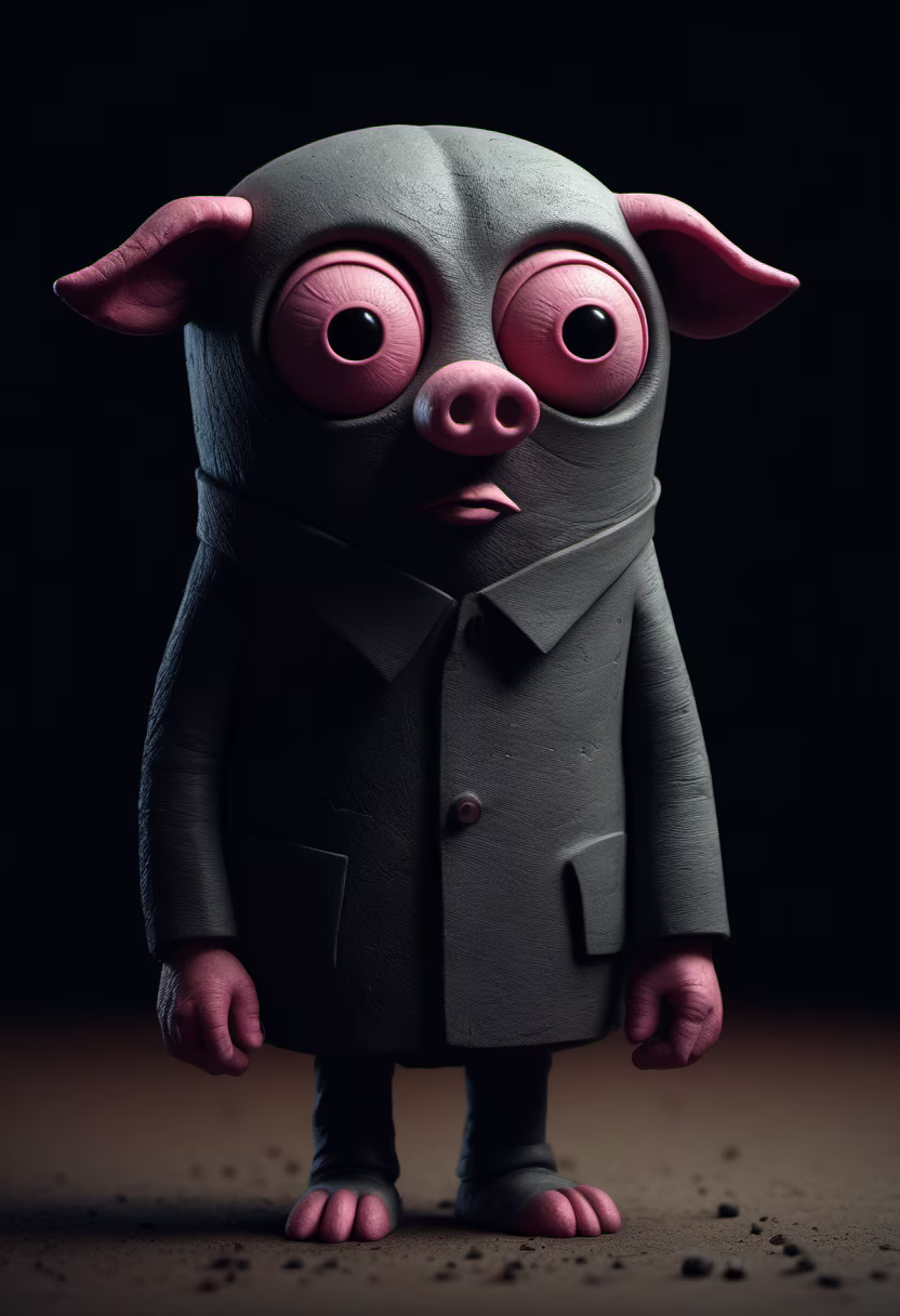 Prompt: (artist ZladislawBeksiński:1.1)(artist Anton Semenov:1.2) dark drawing, Piggy with big eyes,craft claystyle (((The image is drawn in digital format with a high level of detail and an emphasis on lighting and textures. It is on trend on artstation and has a cinematic look. quality)))