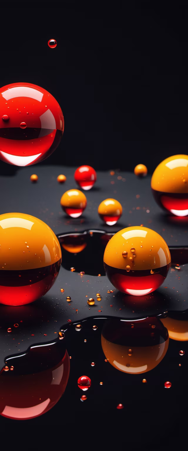 Prompt: a group of red and yellow spheres sitting on top of a black surface, inspired by Mike Winkelmann, trending on polycount, digital art, water droplets on lens, black and orange color palette, floating molecules, instagram post