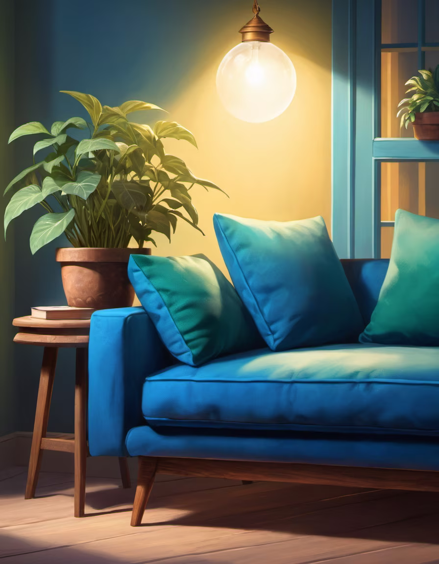 Prompt: Blue sofa, wooden table, living room, cozy, illuminated, night, light and shadow, a pot of green plants, side view, texture, high quality, high detail