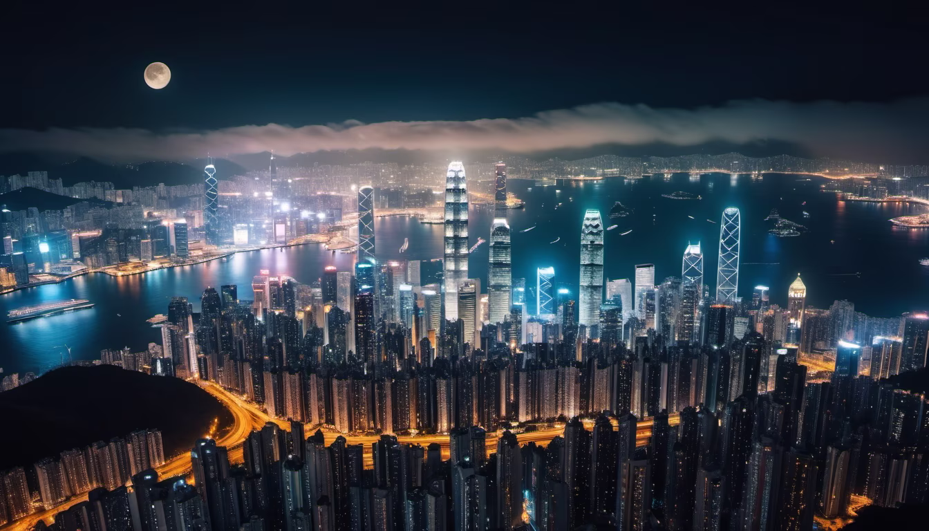 Prompt: At hong kong, City night scene shot from 10,000 feet, like a surreal dream, Drone shooting of light and shadow trails in bustling cities from above, he night glow of the dim moon turns snow into a diamond dusty scattering of brilliance,hyperrealistic image,solarization effect,4K HD, H