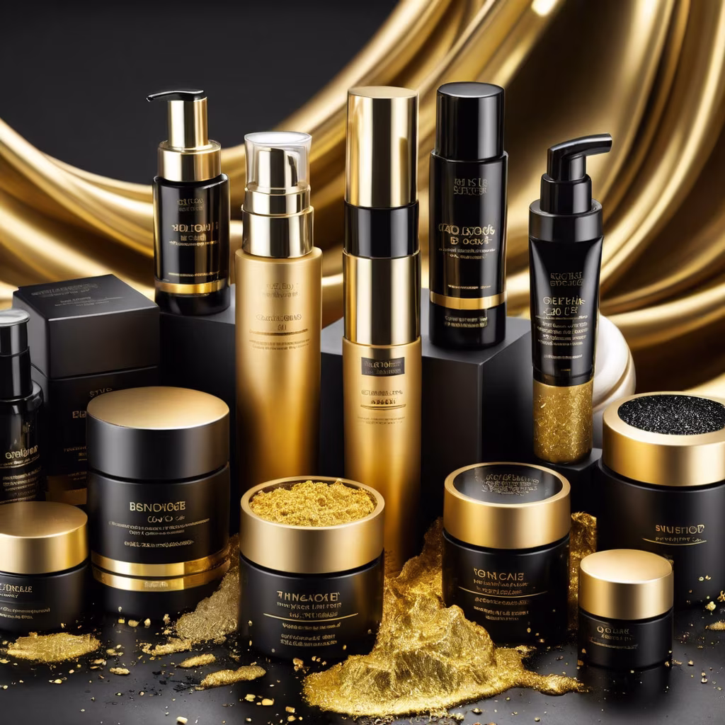 Prompt: skincare products in black and golden colour , body lotion , minimal ,. clean image, hd quality no background