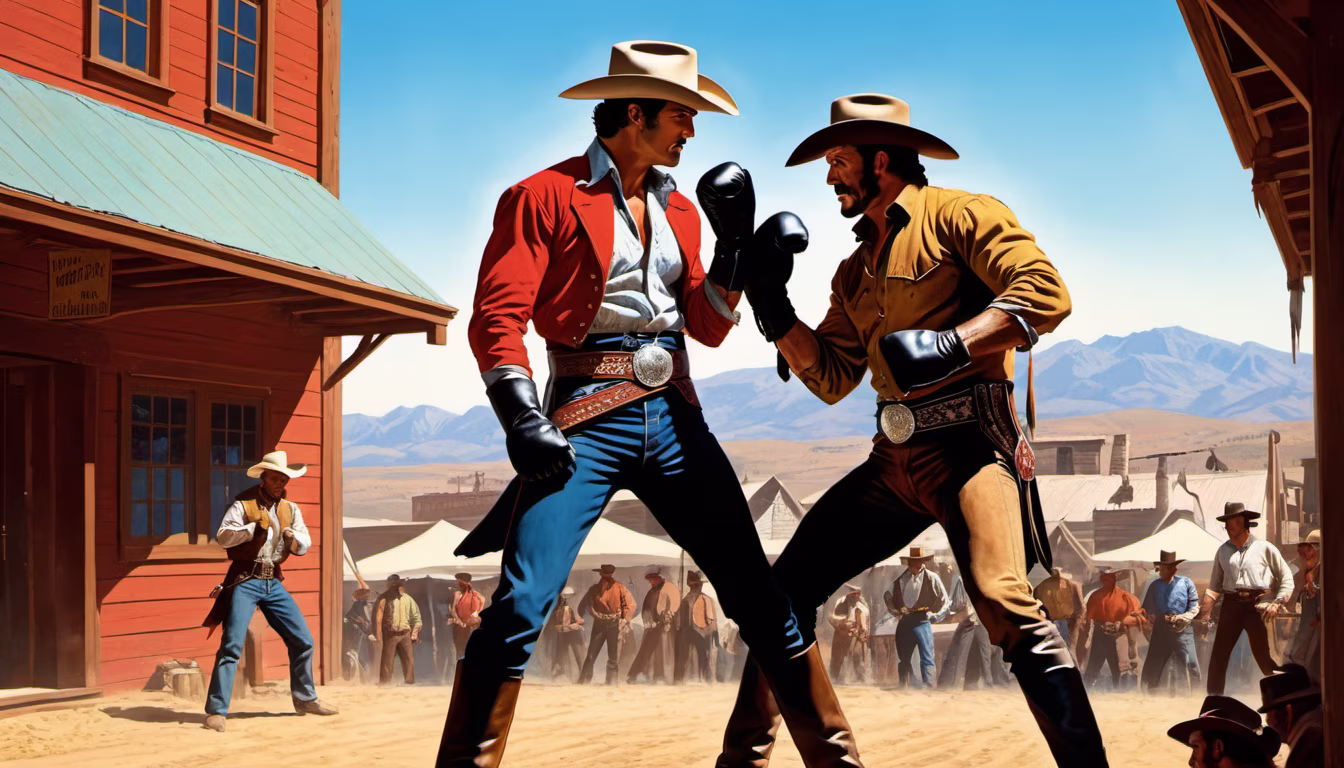 Prompt: western style, wild west style, full view, full body, two cowboys boxing in the ring, against the background of the old town, the mountain, fighting pose, 19th century, colorful, dark light, realistic, vibrant colors, detailed facial features, detailing, detailed background, quality, by Charles Deas Frank Miller, Alex Ross. Boris Vallejo
