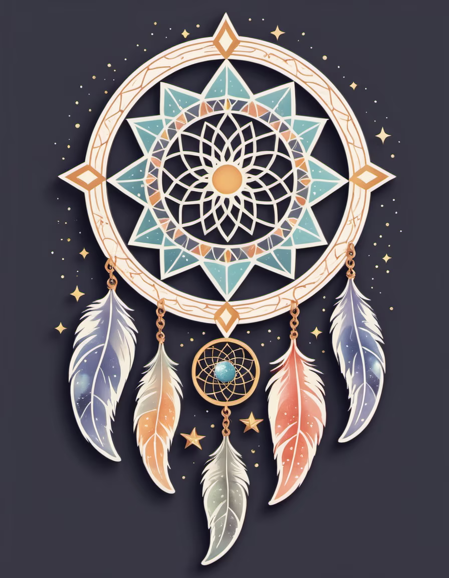 Prompt: A detailed illustration merging the cosmic theme with a dreamcatcher design, intertwining stars and planets within its intricate patterns T-shirt designs, magic splash,t-shirt design, in the style of Studio Ghibli, pastel tetradic colors, 2d vector art, cute and quirky, fantasy art, low-poly, soft lighting, bird's-eye view, isometric style, retro aesthetic, focused on the character, 4K resolution, photorealistic rendering,using Cinema 40,ensure that the illustration is standalone without any background, making it easier to remove