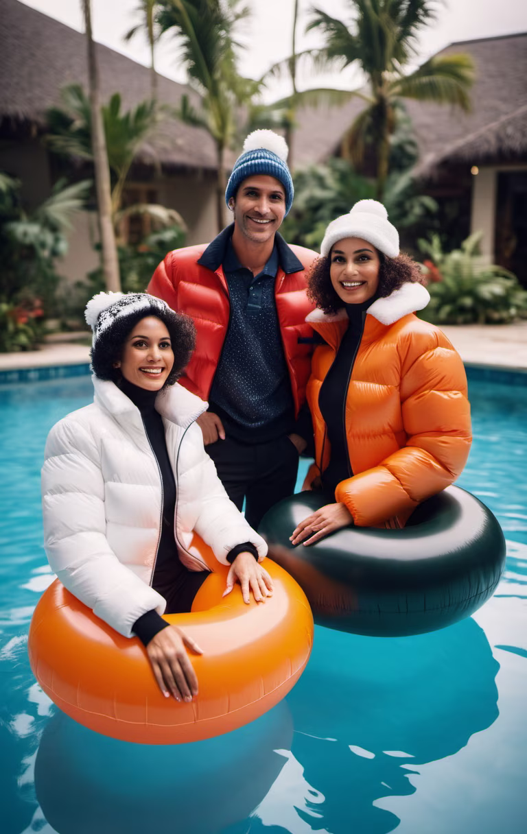 Prompt: 1980s adult friends of different ethnicity on pool floats in a tropical pool wearing winter snow outfits