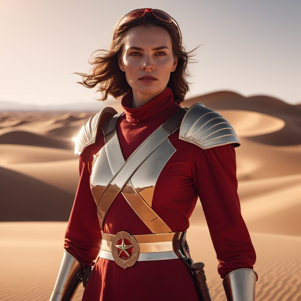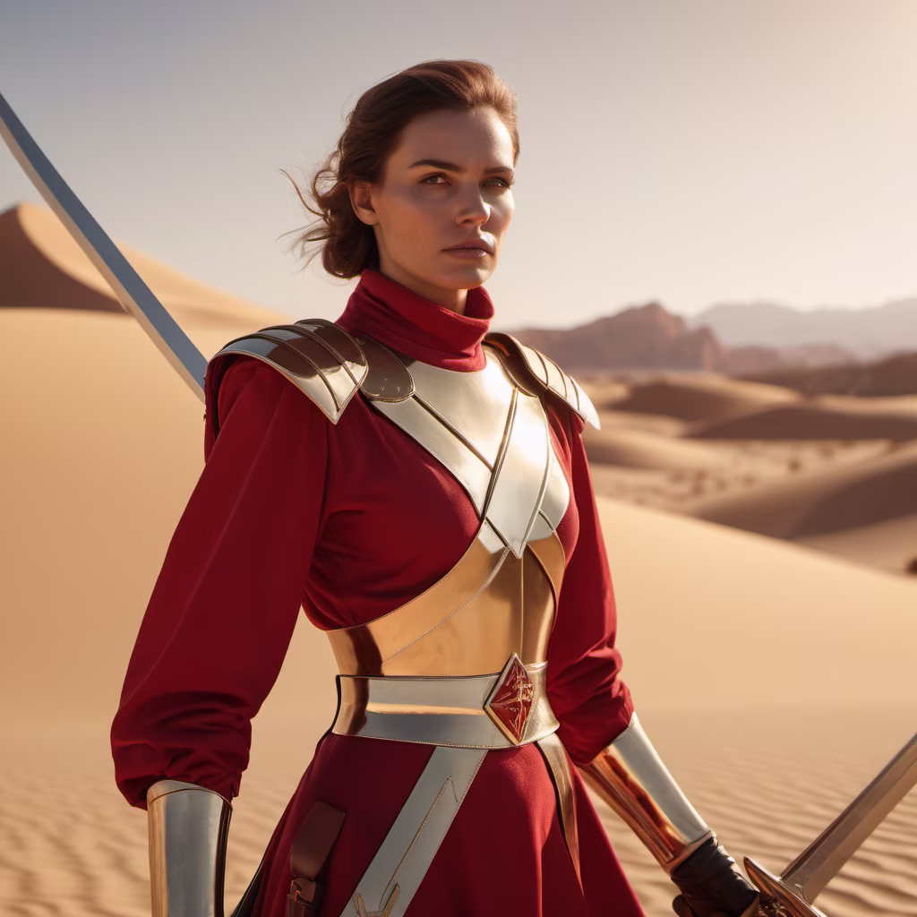 Prompt: a communist cyborg girl pope on desert with large swords, in the style of vray, red and gold, precisionist lines, chrome-plated, polished metamorphosis, by wlop