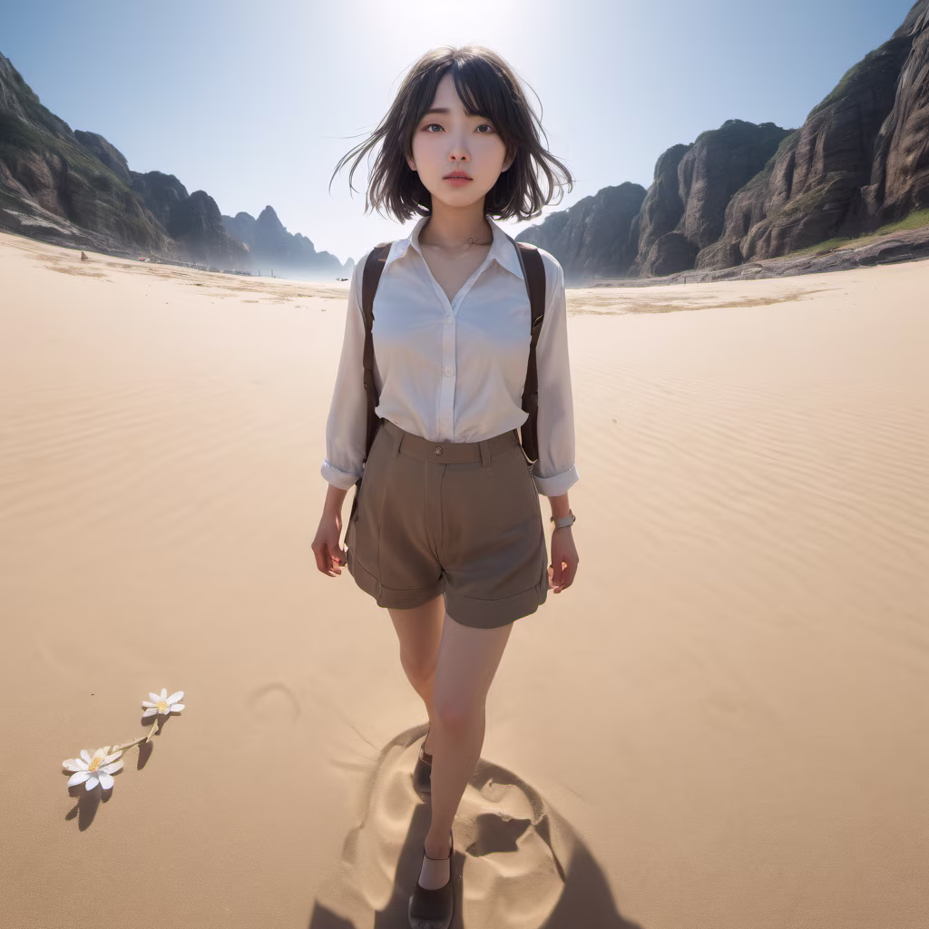 Prompt: masterpiece,best quality,ultra-detailed,1girl,from below,full body,Fisheye lens,walking,sand,solo,\u003clora:仰拍视角_v1.2:0.8\u003e,\u003clora:下面加朵花:0.7\u003e,bottomless,secret flower,(nsfw:1.2),